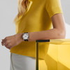 A Black Bay Pro háromféle szíjjal kapható. Választhatunk egy klasszikus fémcsatot, amely a Tudor ötvenes-hatvanas évekbeli modelljeit idézi, vagy egy fekete szövetszíjat, amely a Jacquard szövési technikával készül. A harmadik választási lehetőség egy hibrid bőr-gumi szíj, amely sportosabb, de mégiscsak elegáns megjelenést sugároz. Az fémcsathoz a Tudor „T-fit” gyorsan állítható csatja tartozik, amely szerszám nélkül és könnyedén finomhangolható.