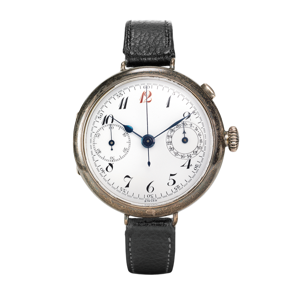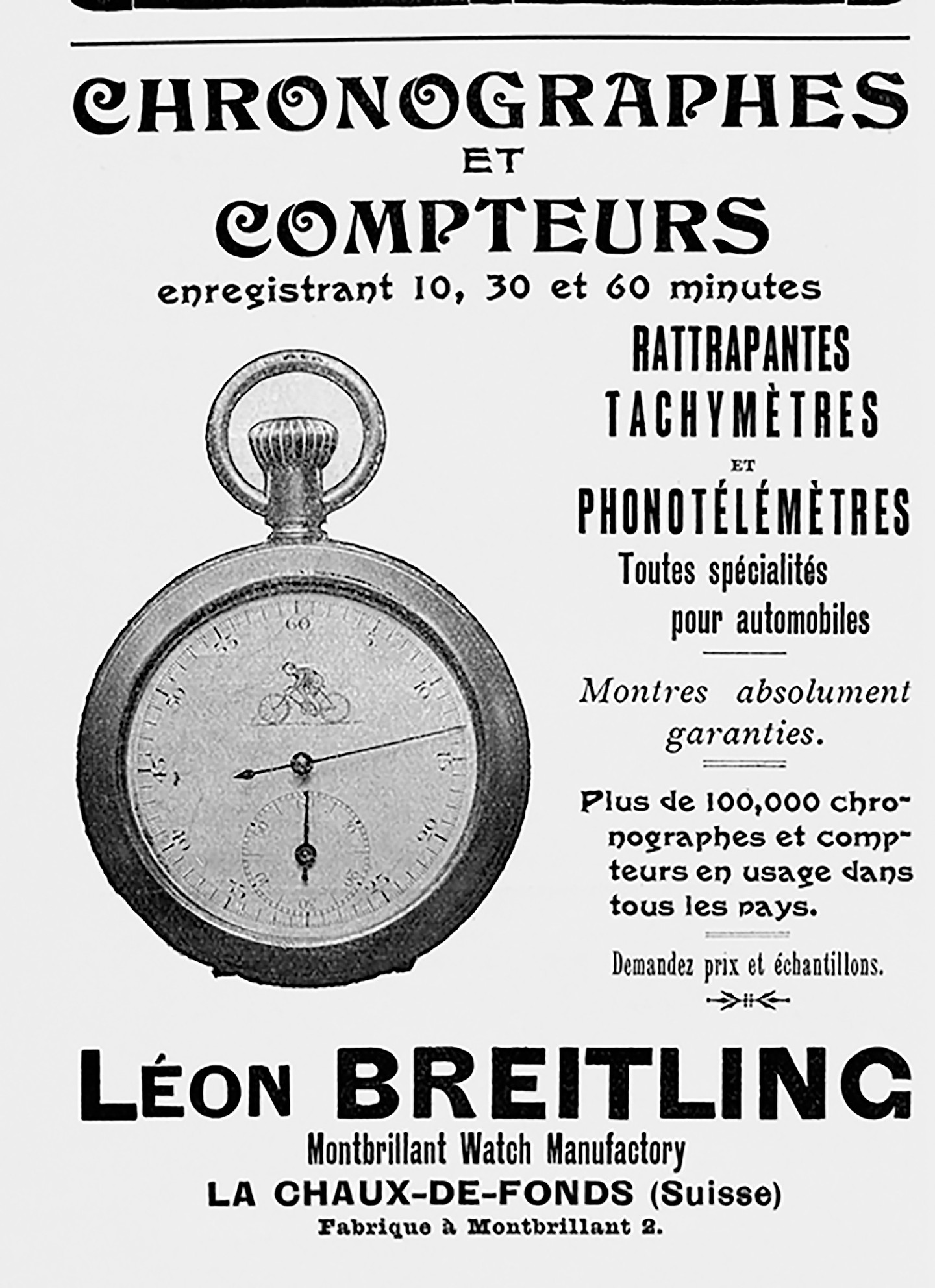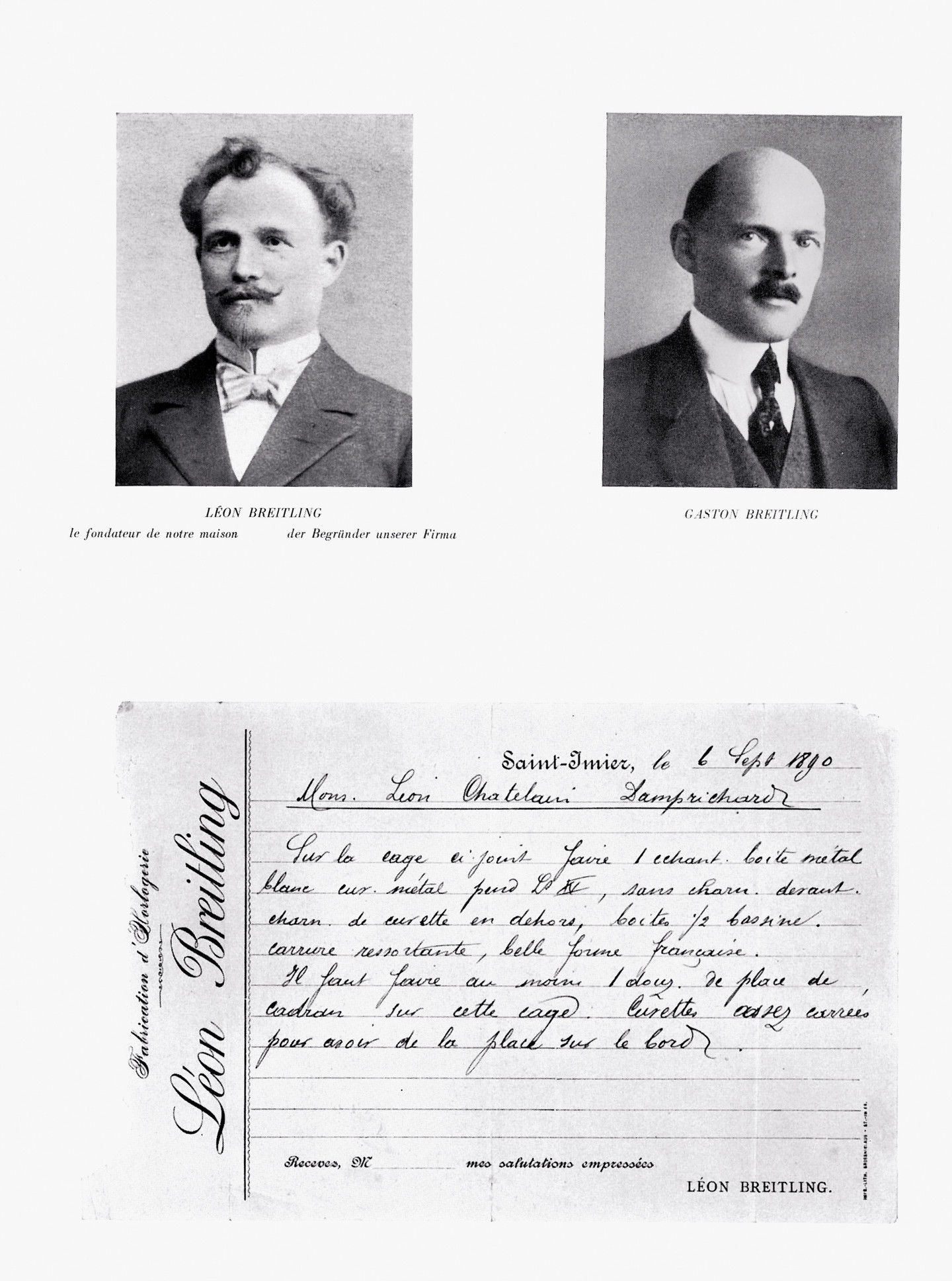 1. kép: Leon Breitling és Gaston Breitling, 2. kép: Hirdető plakát, 3. kép Nyomógombbal rendelkező Breitling kronográf