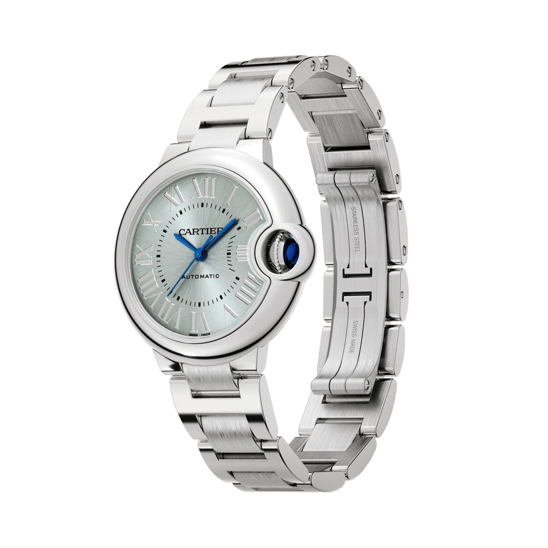 Ballon Bleu de Cartier óra, 33 mm, mechanikus óramű, automata felhúzással. Acél tok, bordázott korona, szintetikus kabócaszerű spinellel díszítve, kék ezüstözött, napsugárral csiszolt számlap, kékes acél kard alakú mutatók, zafírüveg, cserélhető acél szíj. Vastagság: 10,16 mm. Vízálló 3 barig (kb. 30 méter/100 láb).