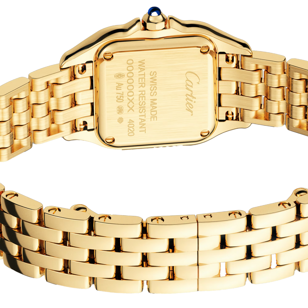 Panthère de Cartier óra, kis (S) modell, kvarc szerkezet. A tok sárga arany 750/1000, méretek: sárgaarany 750/1000-es karperec, méret: 23 mm x 30 mm, vastagság: 6 mm, korona kék zafírral, ezüstözött számlap, kékített acél kard alakú mutatók, sárgaarany 750/1000-es karperec. Vízálló 3 barig (kb. 30 méter). Az óraszíj hossza kissé eltérhet a fotóhoz képest.