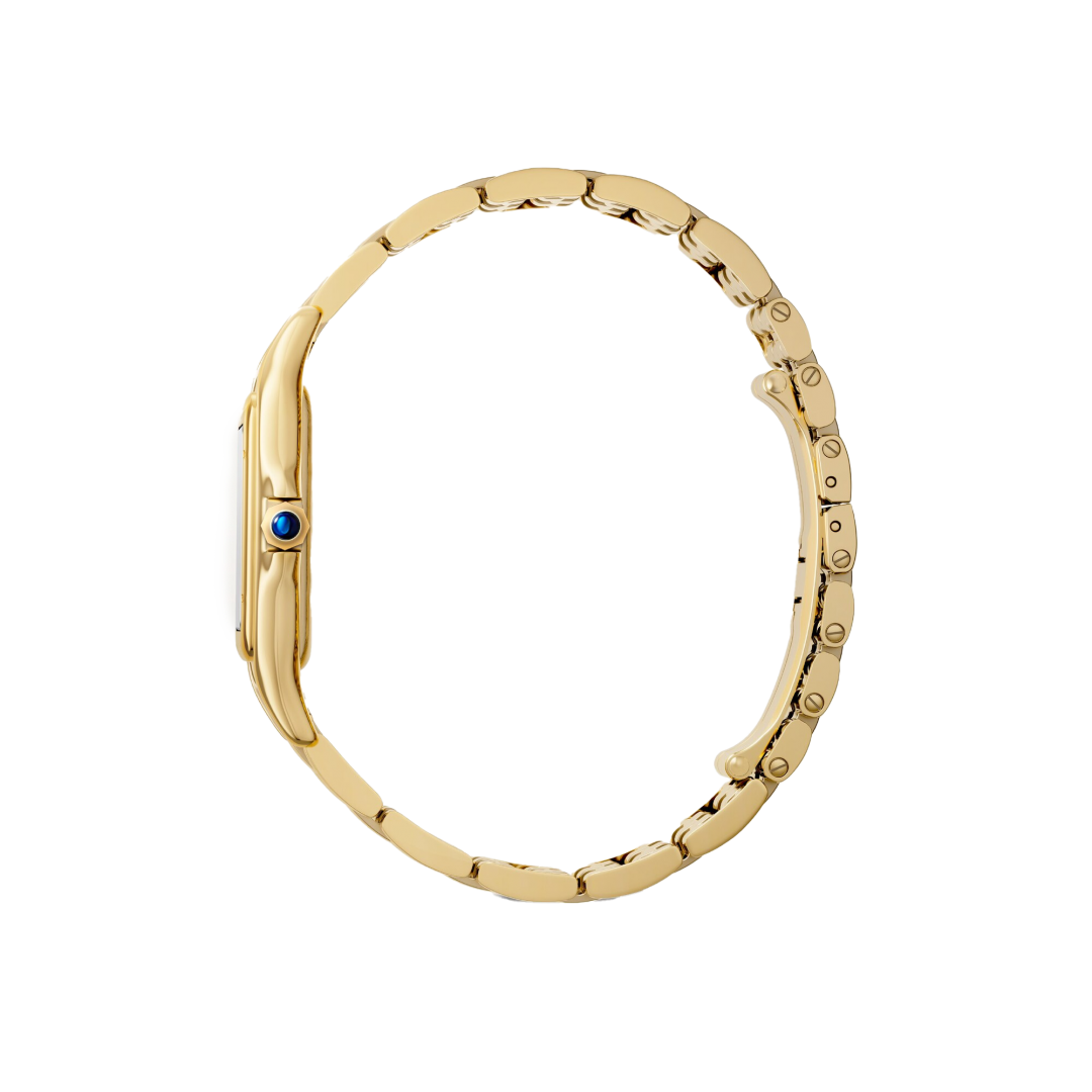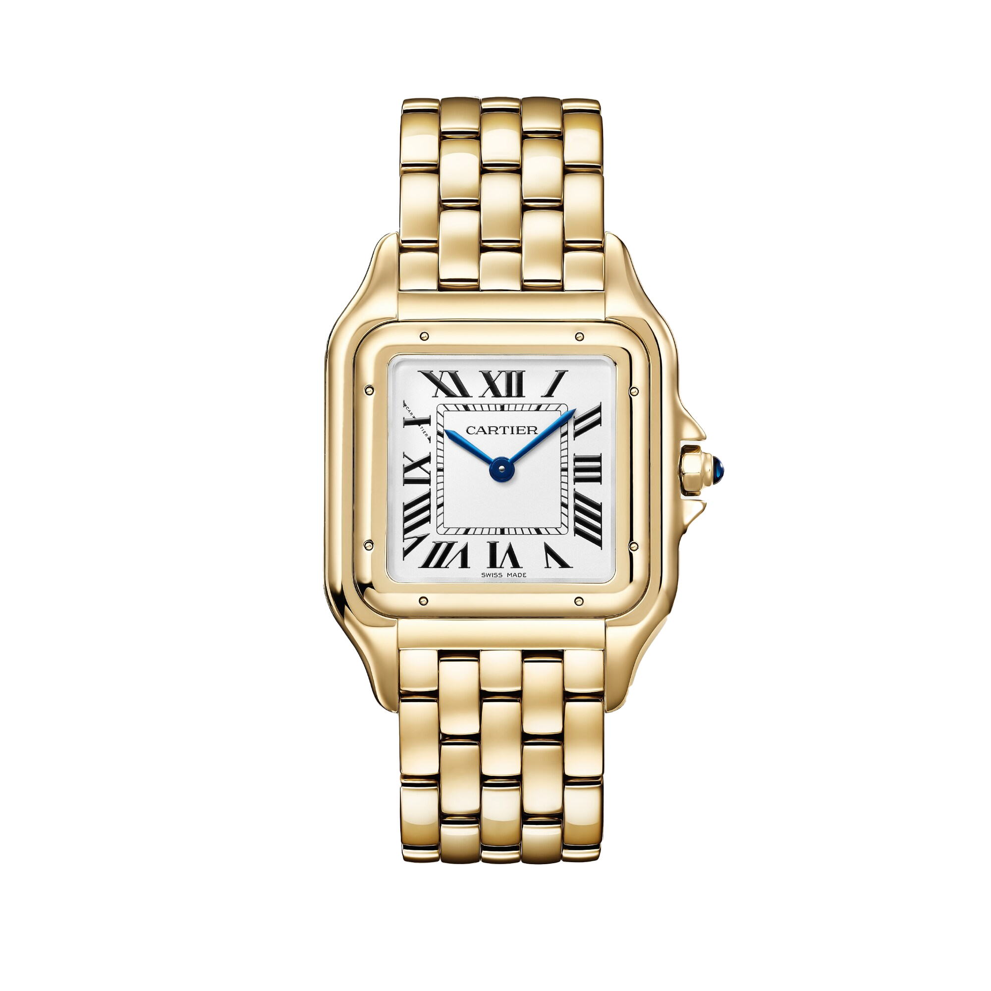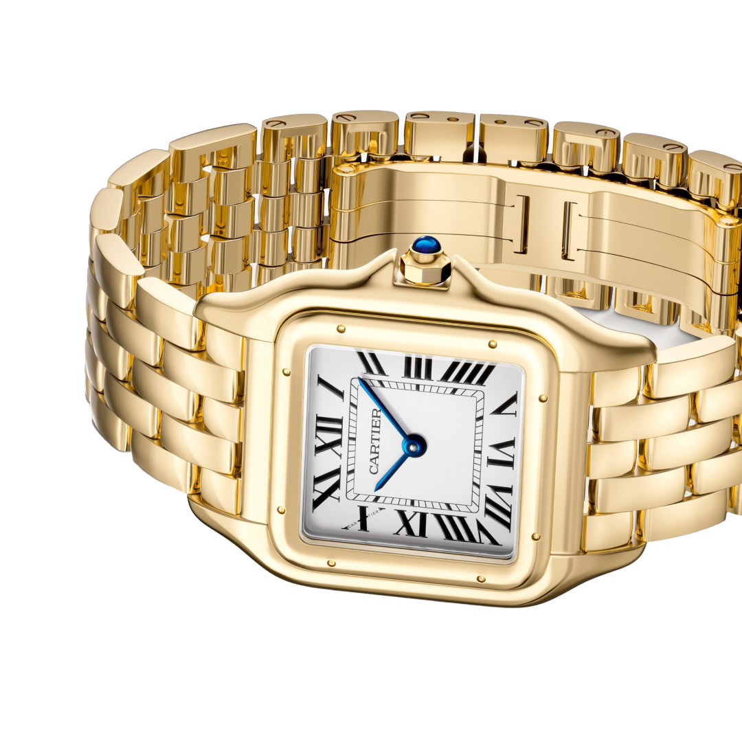 Panthère de Cartier óra, nagy modell, kvarc óra. 18K sárga arany (750/1000) tok. Méretek: korona kék zafírral, ezüstözött számlap, kékített acél kard alakú mutatók, 18K sárgaarany (750/1000) csat. Vízálló 3 barig (kb. 30 méter/100 láb).