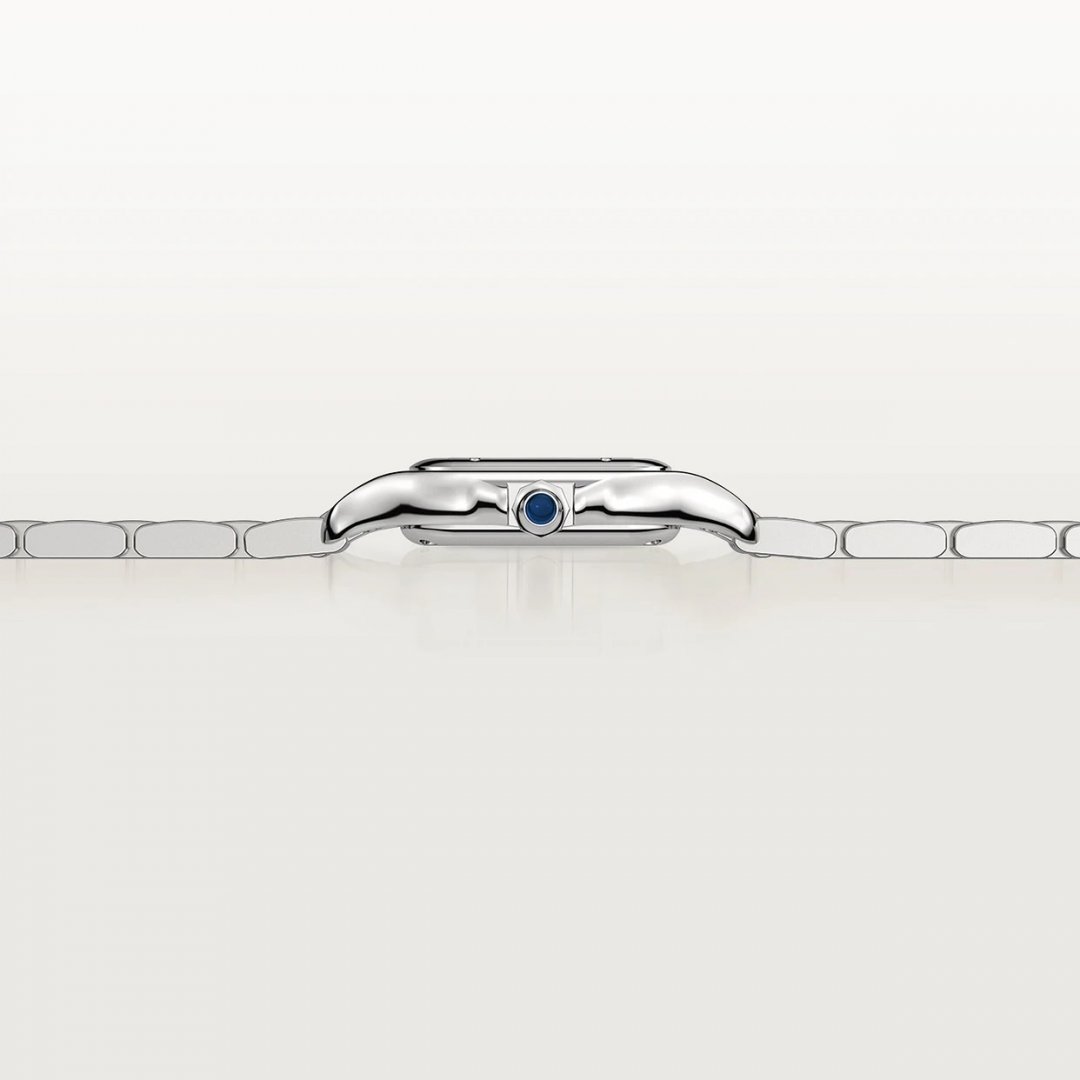 Kis méretű (S) modell, kvarc óraszerkezet. Rozsdamentes acél tok, méret: 23 mm x 30 mm, magasság: 6 mm, felhúzókorona, szintetikus kék spinellel díszítve, ezüst színű számlap, kard alakú kékített acélmutatók, rozsdamentes acél csat, vízálló 3 bar-ig.