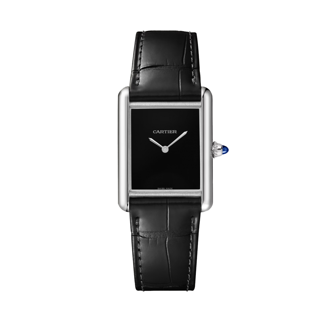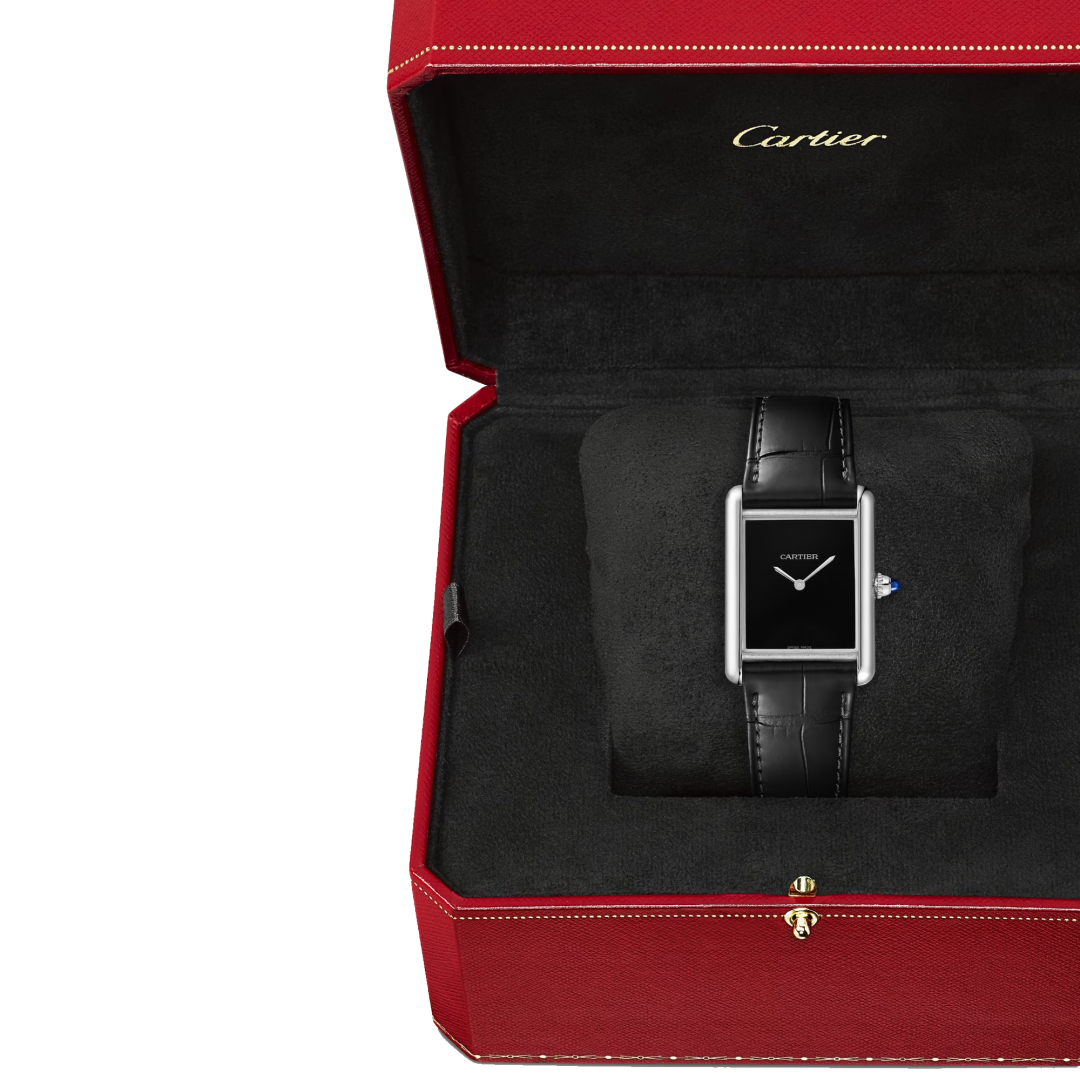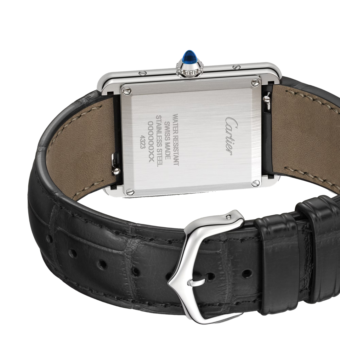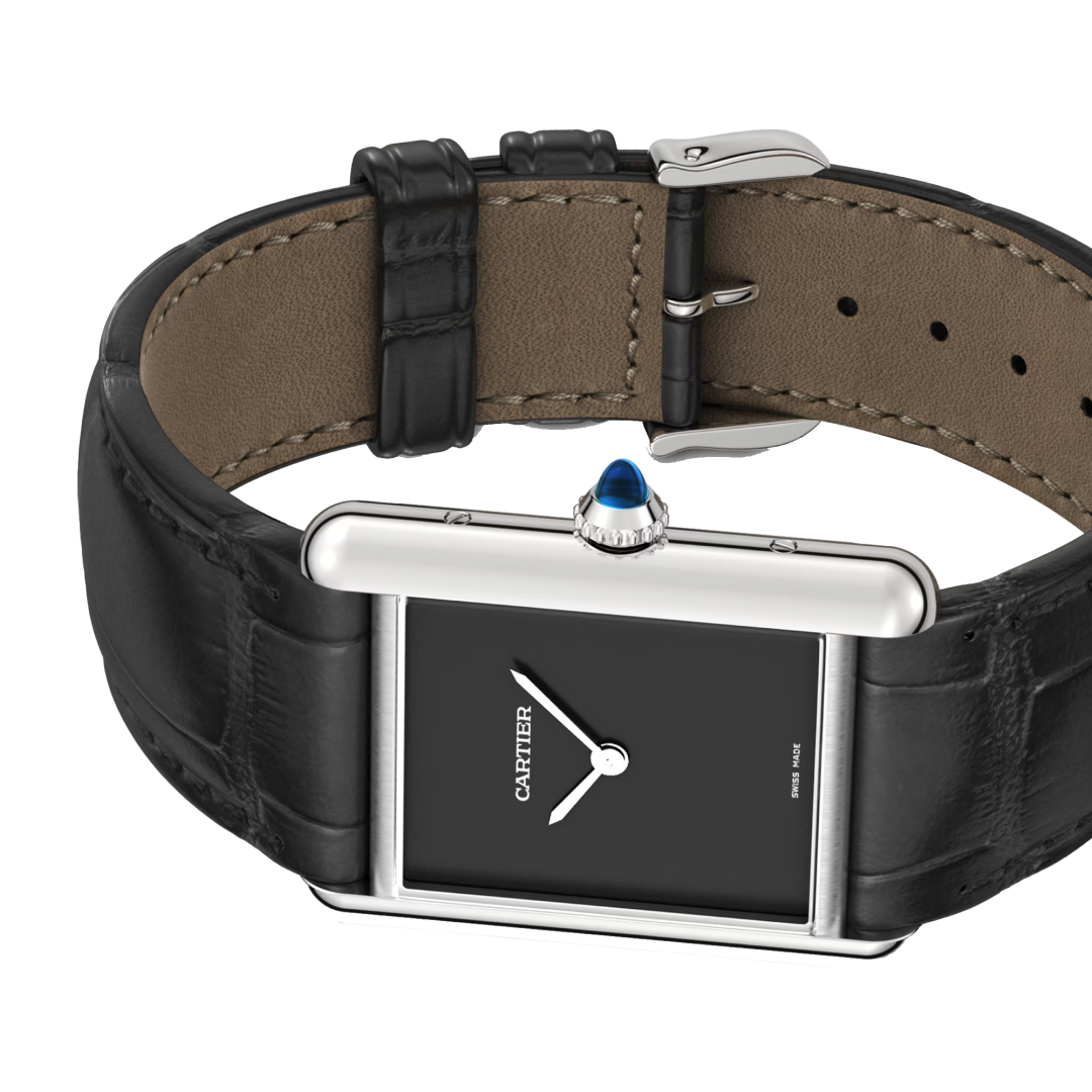 Női karórák luxus órák luxus karórák webshopja Cartier Tank Must Large model acél tok bőr szíj. Szerkezet típusa: Kvarc óra, szíj anyaga: bőr, vízállóság: 30 m, számlap színe: fekete.
