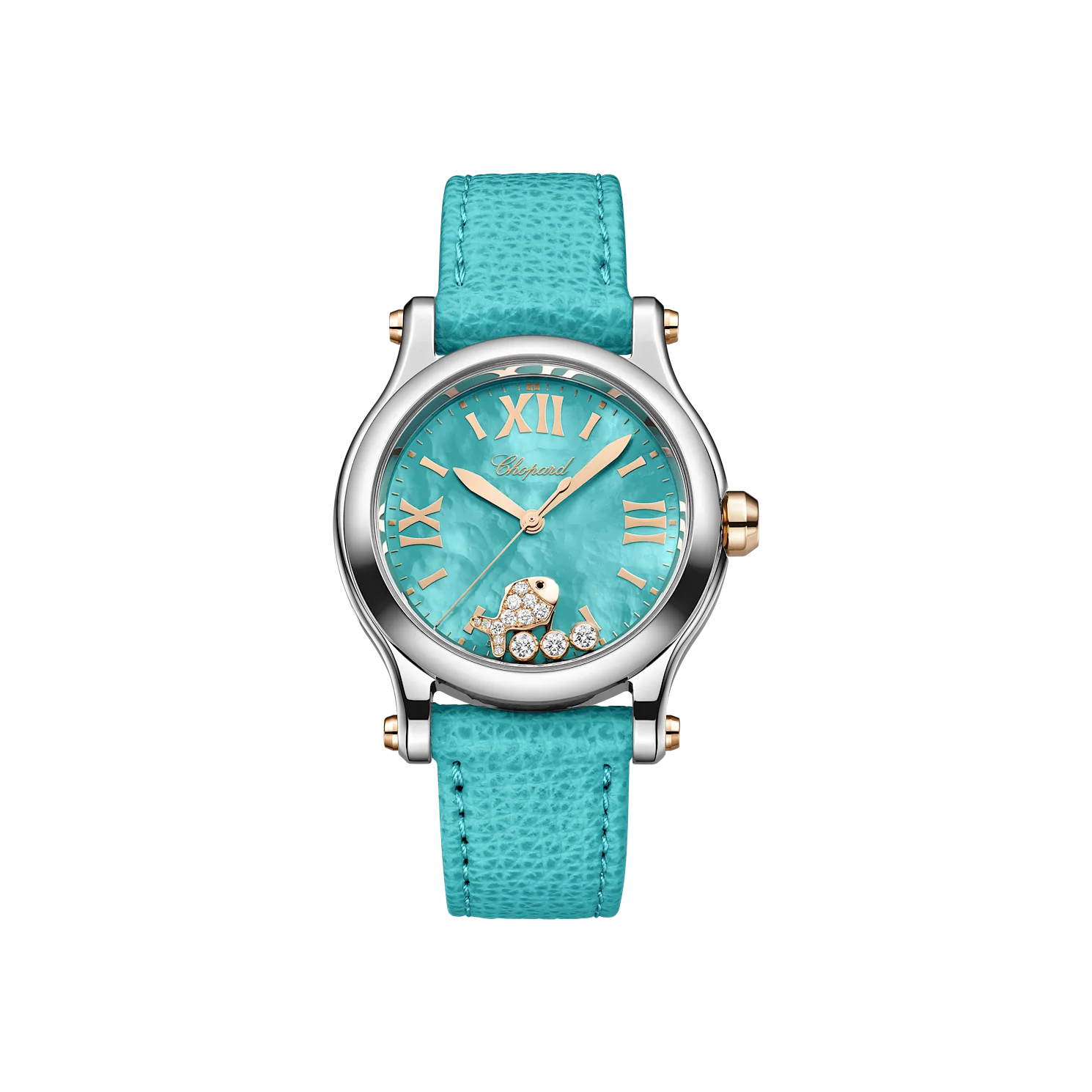 A Chopard Happy Fish egy különleges, limitált kiadású (250 darab) női óra, 36 mm átmérőjű, rozsdamentes acél és 18 karátos rózsaarany kombinációjával. Türkizkék, textúrázott gyöngyház számlapja van, benne valódi, szabadon mozgó gyémántokkal 0,22 karát összsúlyban. A működést kvarcszerkezet biztosítja, a tokban zafírüveg található. A cserélhető szíj matt türkiz bőrből készült és klasszikus csattal záródik.