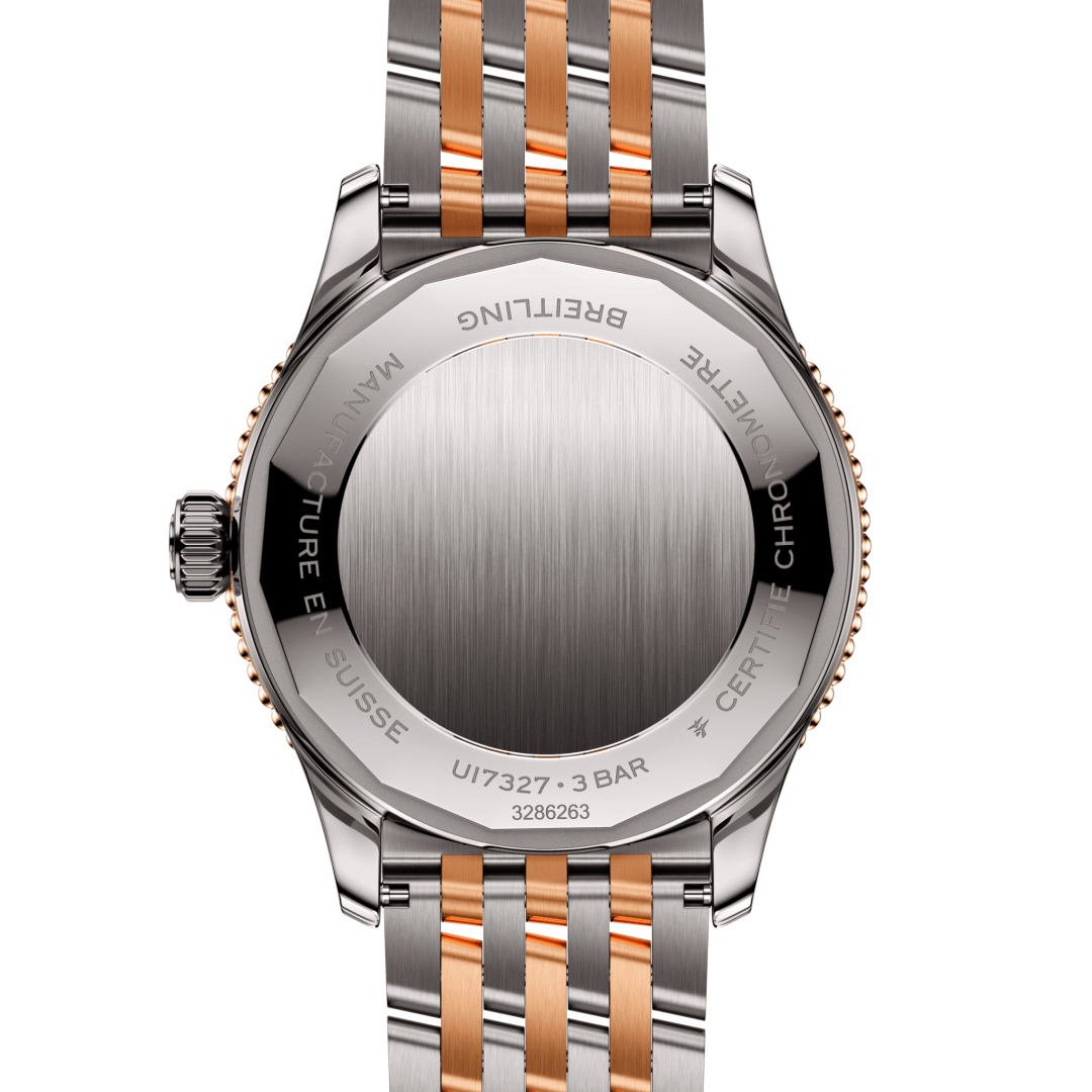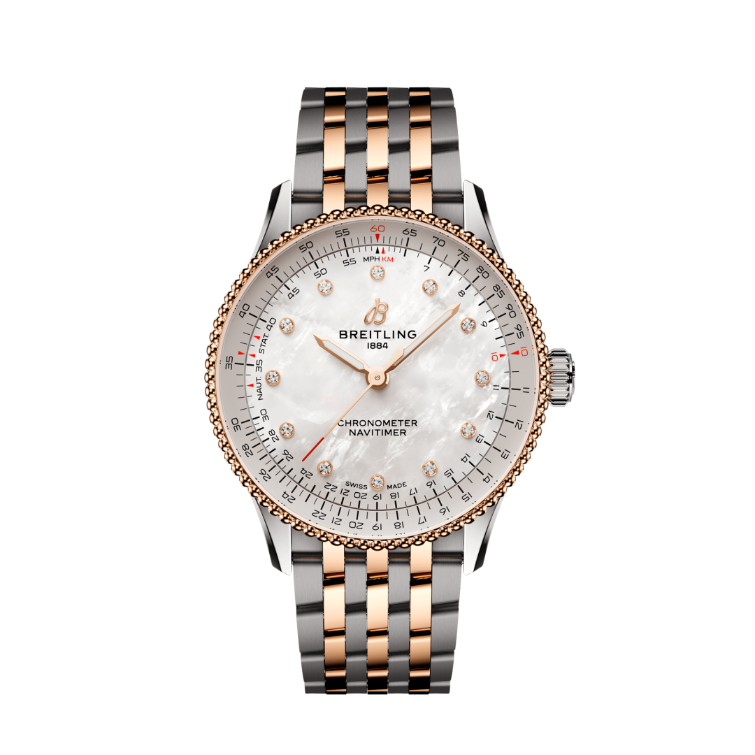 Breitling Navitimer Automatic 36 Gold & Diamanten, Automatik, 36 mm. Die Uhr hat folgende Funktionen: Lumineszenz. Die Grundparameter der Uhr sind: bewegungsart ist mechanische Uhr mit automatischem Aufzug, wasserabweisend ist 30 m, ziffernblattfarbe ist perlmuttern und armbandmaterial ist Stahl und Gold.