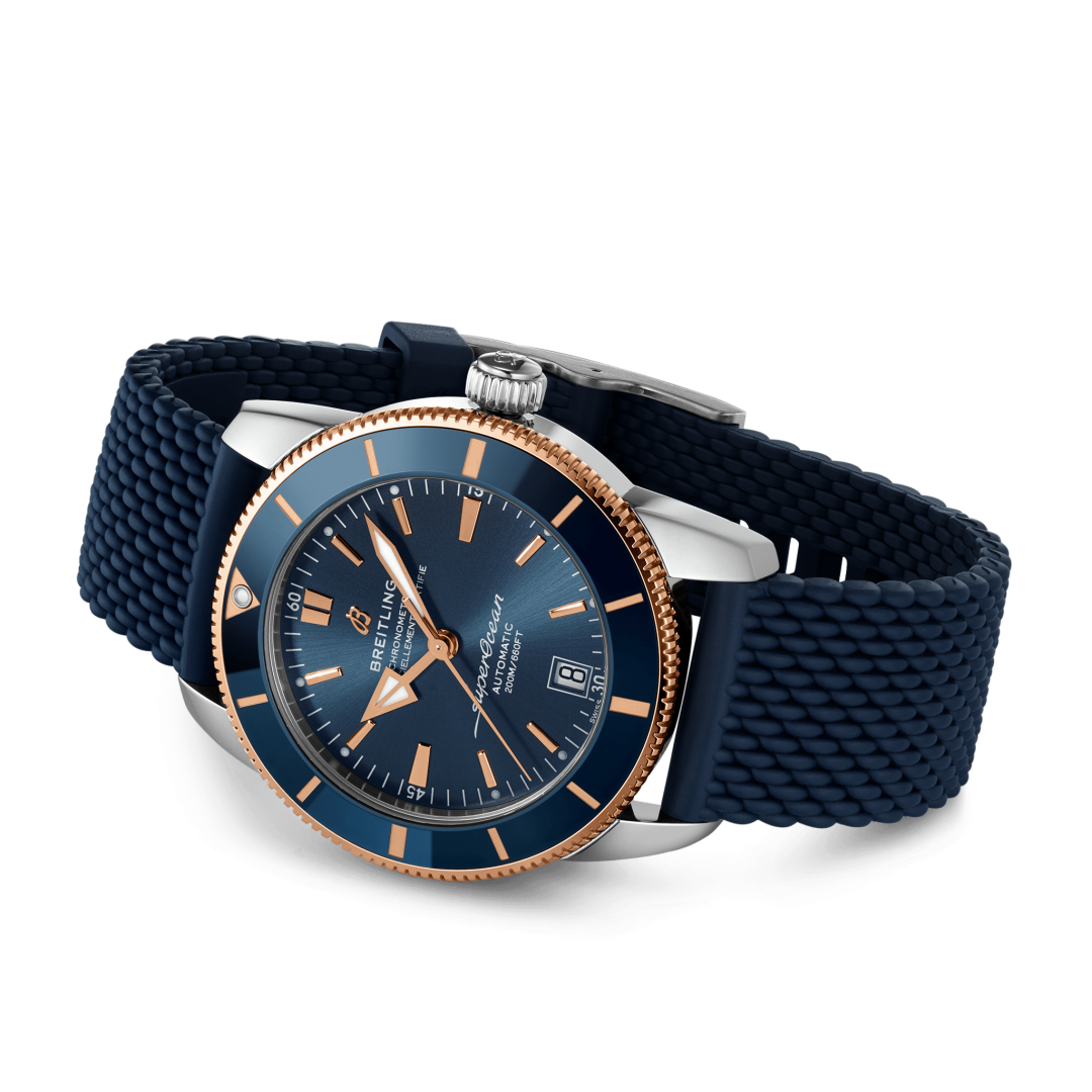 Breitling Superocean Héritage B20 Automatic 42 Manufaktúrny kaliber, Wasserdicht 200M, 42 mm. Die Uhr hat folgende Funktionen: Lumineszenz und Datum . Die Grundparameter der Uhr sind: bewegungsart ist mechanische Uhr mit automatischem Aufzug, armbandmaterial ist Gummi, wasserabweisend ist 200 m und ziffernblattfarbe ist blau.