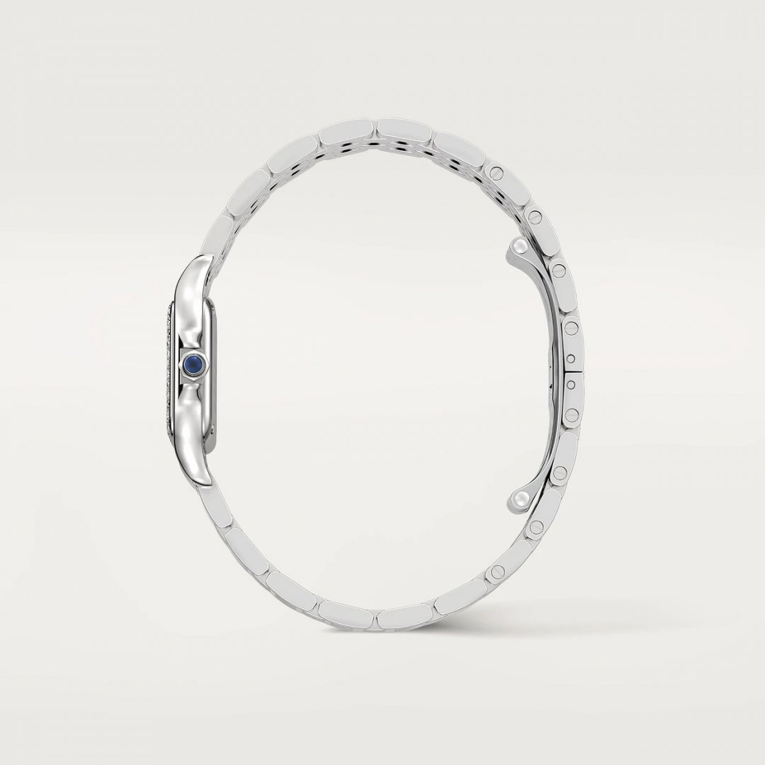 Kleines Modell, Quarzwerk. Gehäuse aus Edelstahl, Lünette mit 36 Diamanten im Brillantschliff von insgesamt 0,24 Karat besetzt. Maße: 23 mm x 30 mm. Höhe: 6 mm. Krone mit einem synthetischen blauen Spinell besetzt, silberfarbenes Zifferblatt, gebläute Zeiger in Schwertform, Armband aus Edelstahl. Wasserdicht bis zu 3 bar.