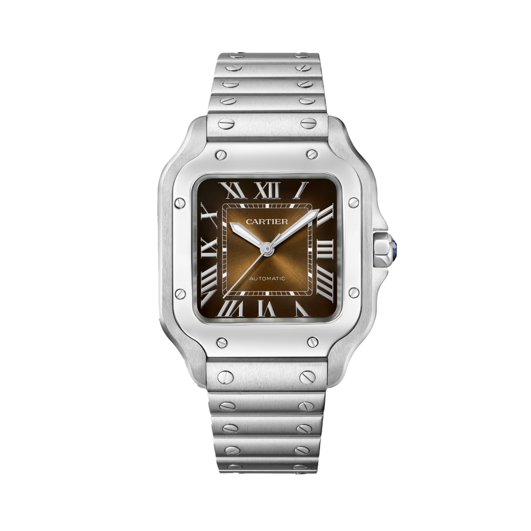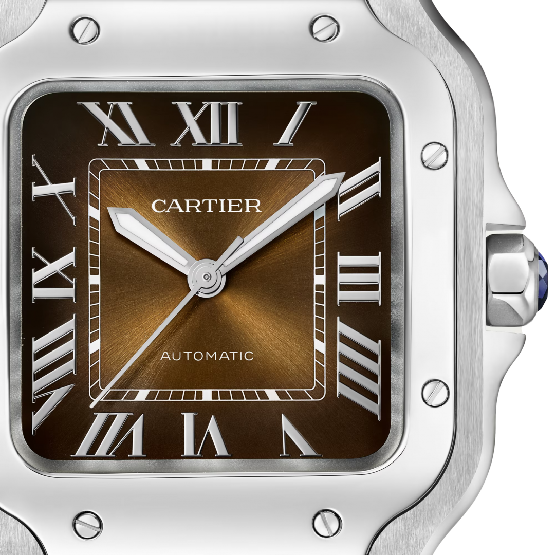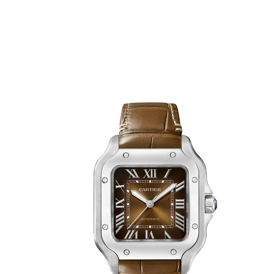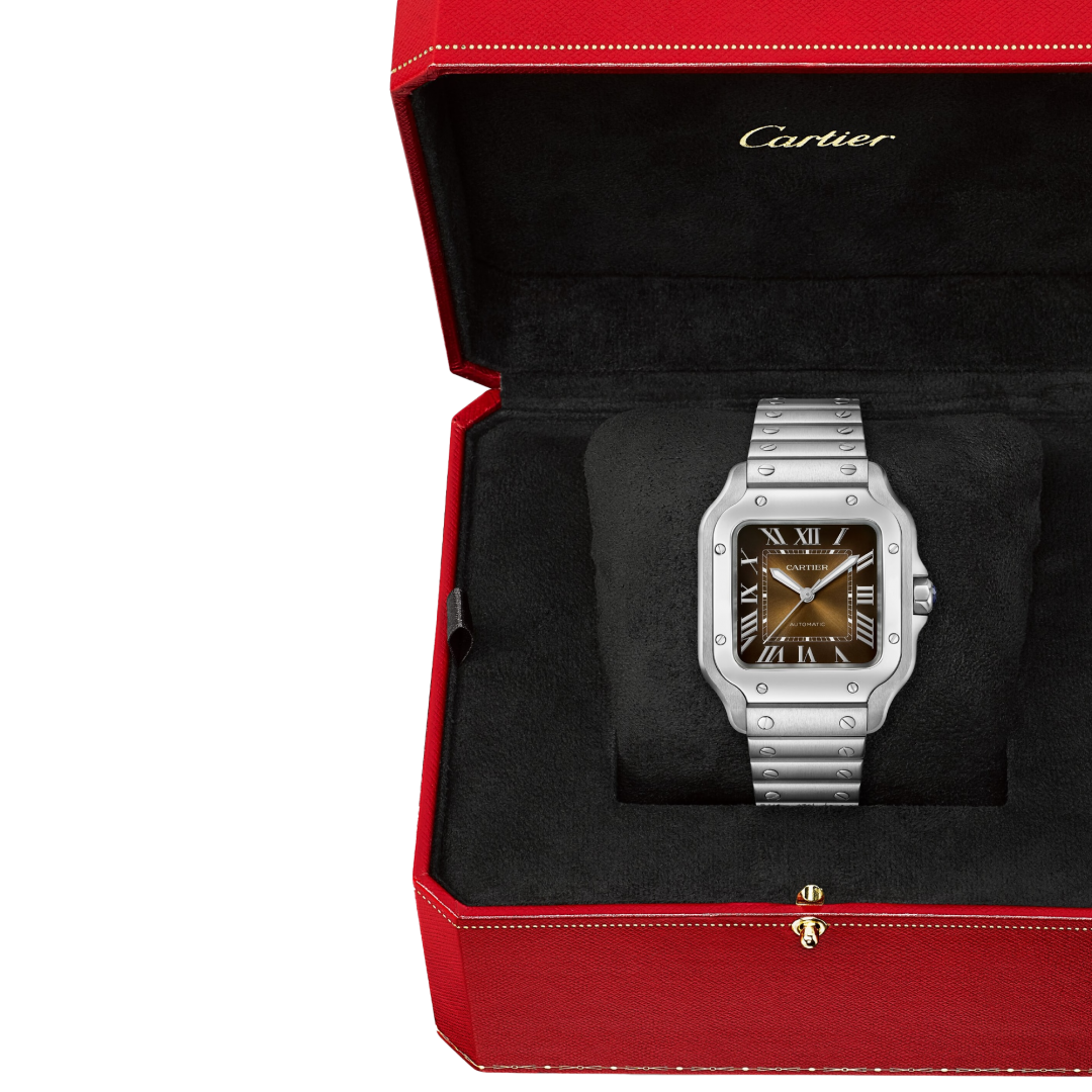 Herren luxus- uhr Cartier Santos de Cartier Mittleres Metallgehäuse zwei austauschbare Riemen. Die Uhr hat folgende Funktionen: Datum. Die Grundparameter der Uhr sind: ziffernblattfarbe ist braun, bewegungsart ist mechanische Uhr mit automatischem Aufzug, armbandmaterial ist bőr und acél und wasserabweisend ist 100 m.