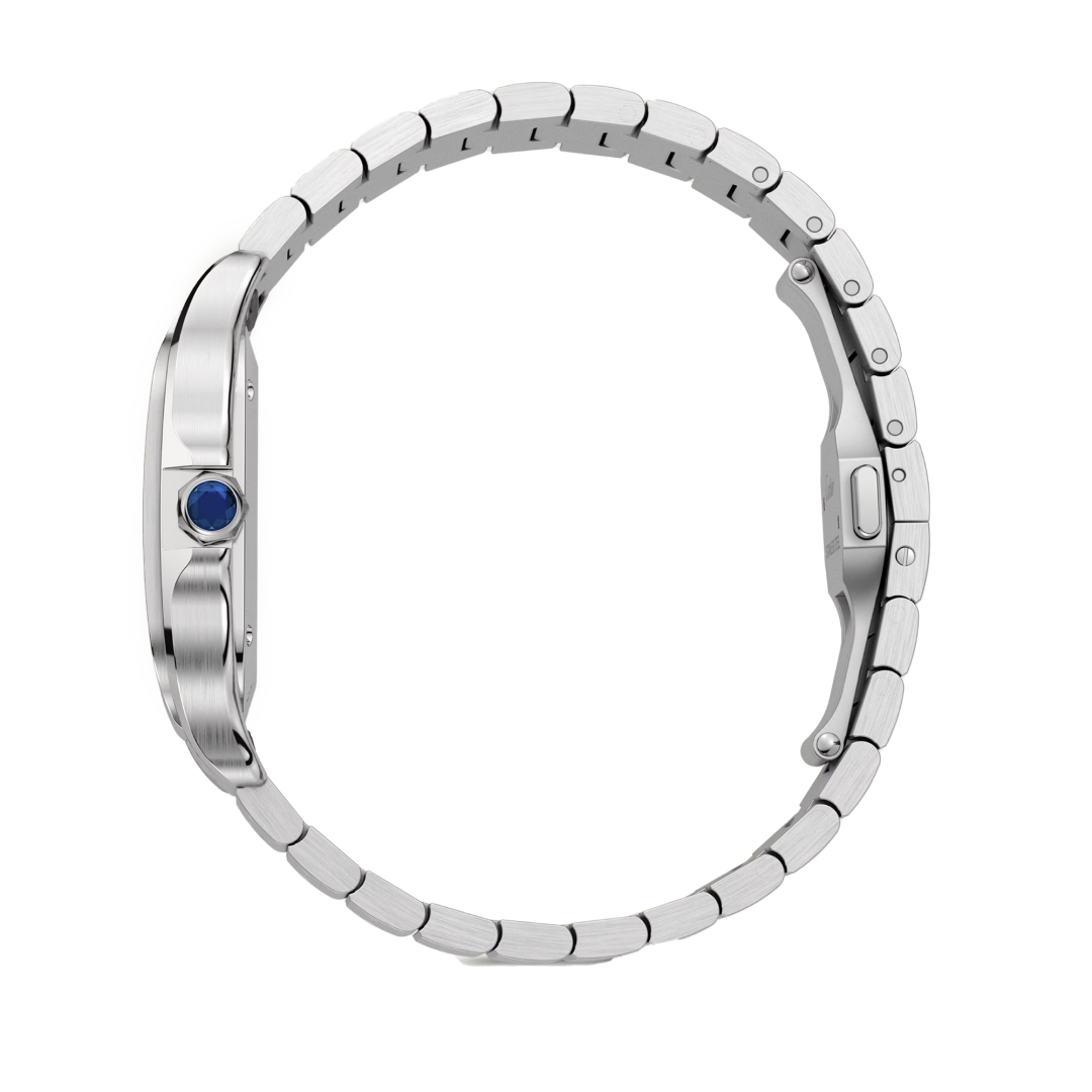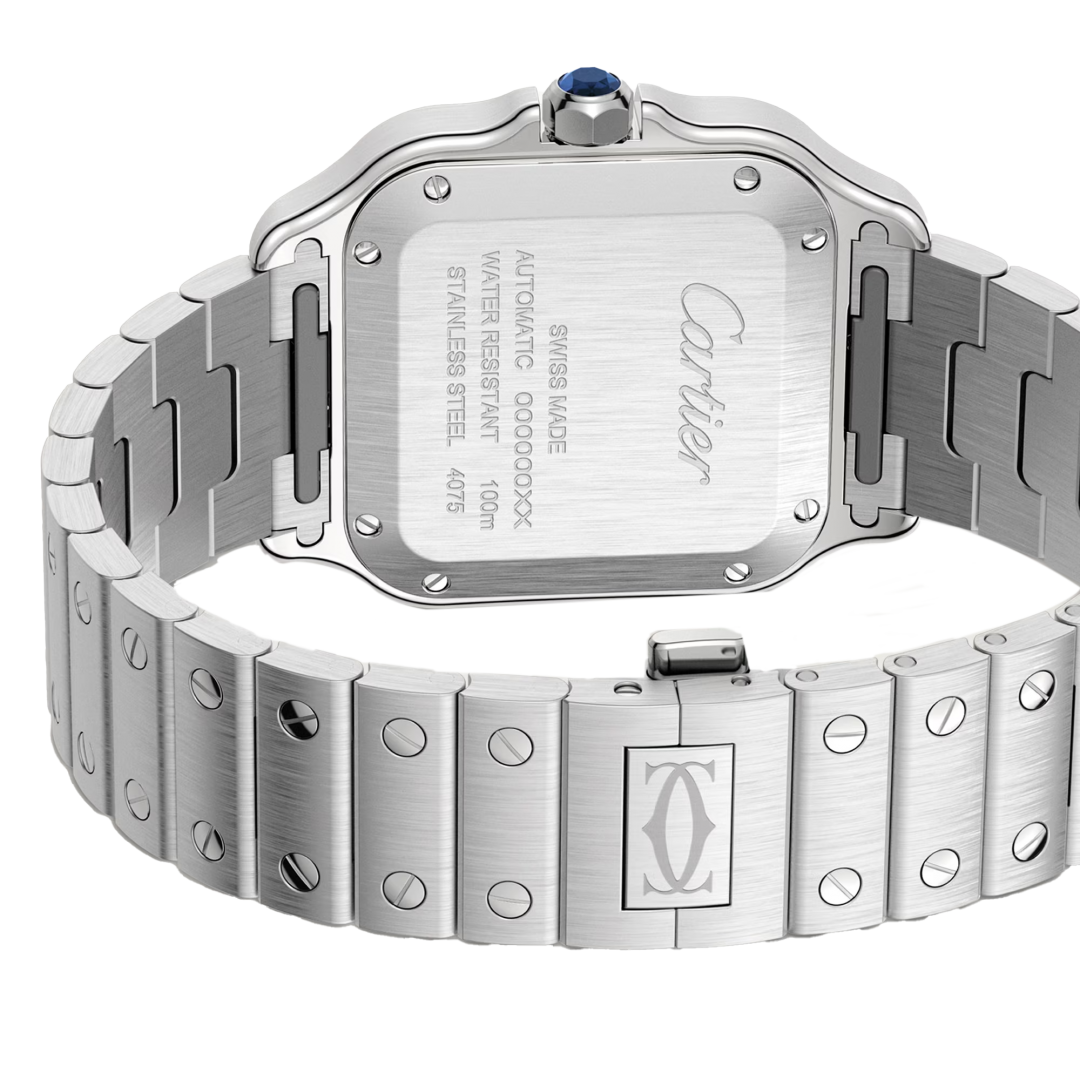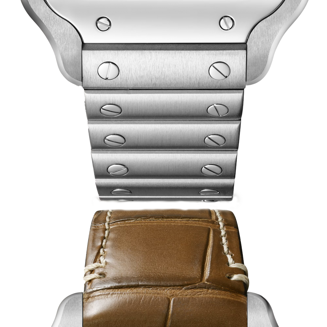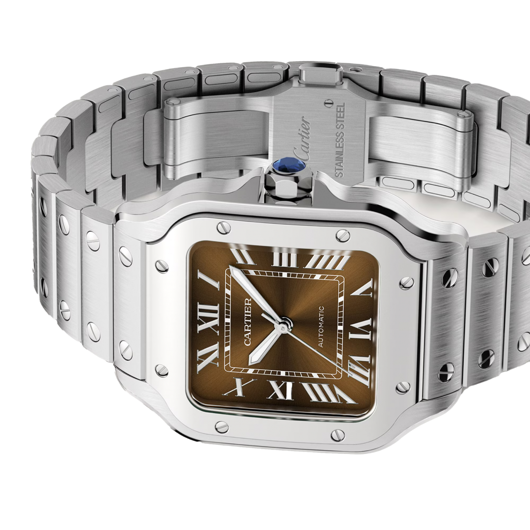 Herren luxus- uhr Cartier Santos de Cartier Mittleres Metallgehäuse zwei austauschbare Riemen. Die Uhr hat folgende Funktionen: Datum. Die Grundparameter der Uhr sind: ziffernblattfarbe ist braun, bewegungsart ist mechanische Uhr mit automatischem Aufzug, armbandmaterial ist bőr und acél und wasserabweisend ist 100 m.
