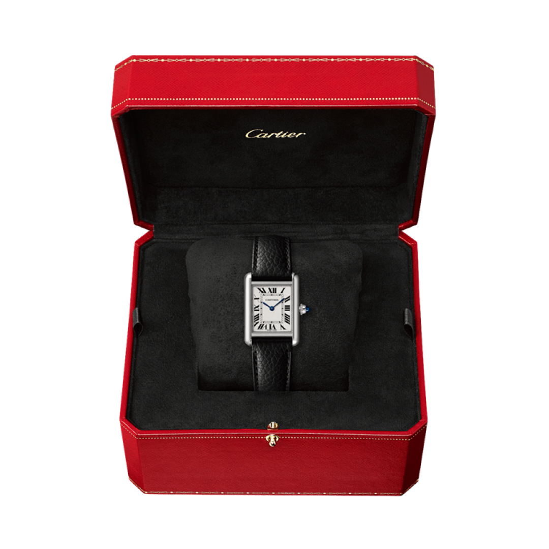 Damen luxus- uhr Cartier Tank Must large, steel, bracelet calfskin, with pin buckle,. Die Grundparameter der Uhr sind: ziffernblattfarbe ist beige und silbern, bewegungsart ist Quarzuhren, armbandmaterial ist bőr und wasserabweisend ist 30 m.