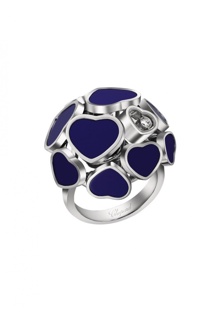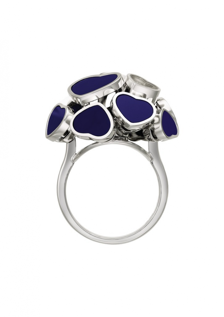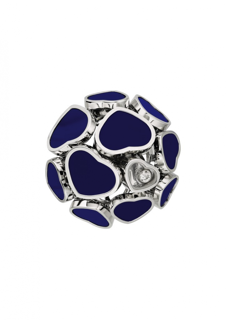 Eine Fülle von Happy Hearts ziert diesen Ring aus 18 Karat Weißgold und ist eine elegante, lustige und kreative Ergänzung der Happy Diamonds Kollektion. Die Herzen sind mit Blaustein eingelegt und haben unterschiedliche Größen. Alle bis auf eines, das zwischen den anderen funkelt und einen der für Chopard charakteristischen beweglichen Diamanten einrahmt, der in einem spielerischen Tanz wirbelt - ein kostbarer Ausdruck für die Freiheit des Geistes und die unbändige Freude der modernen Frau.