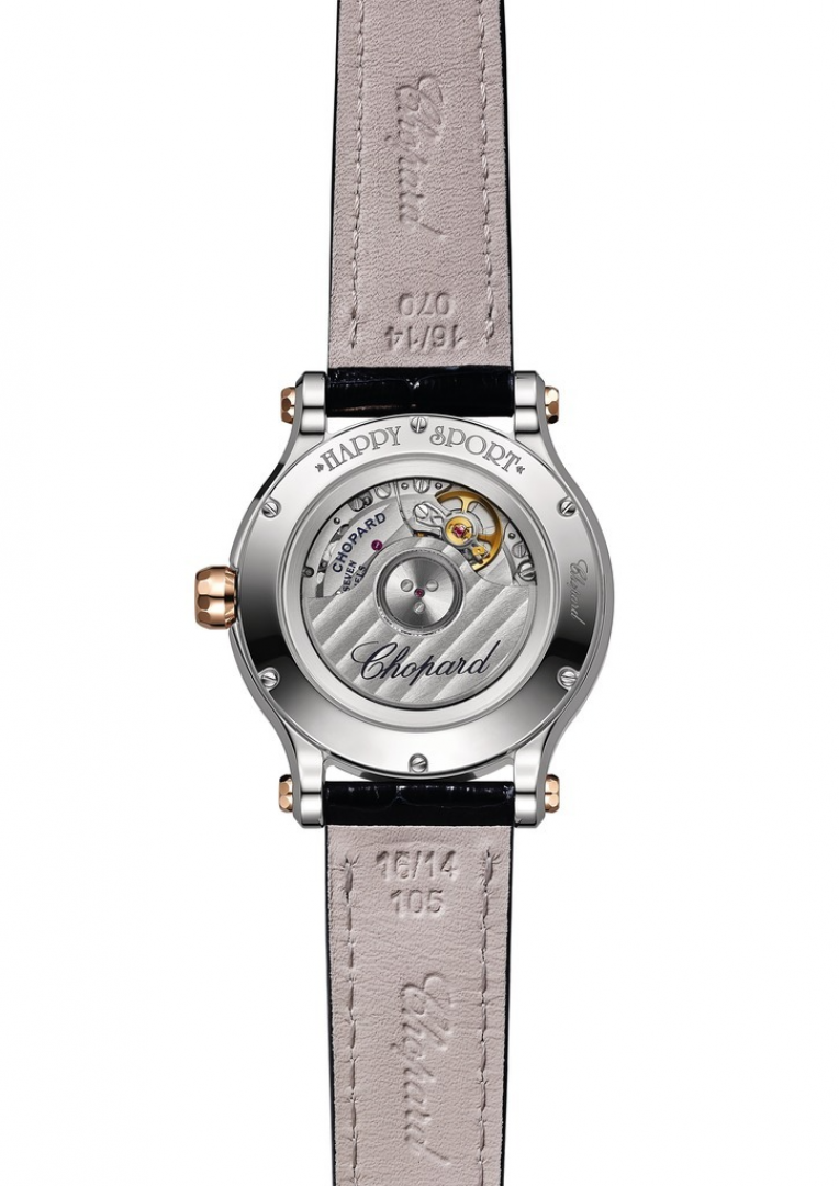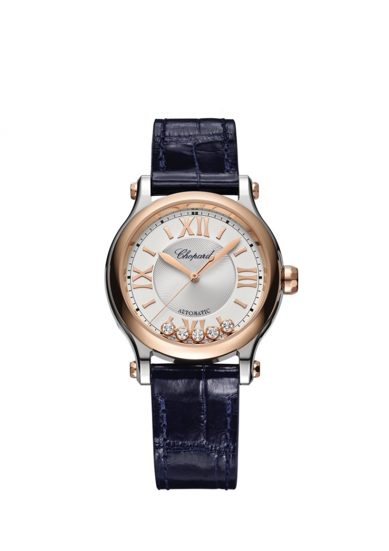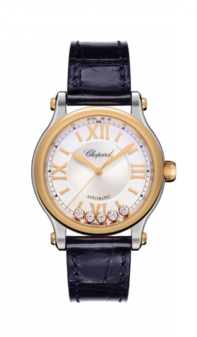 Damen luxus- uhr Chopard Happy Sport 33-mm-Gehäuse aus Stahl und Gold, Krokoband. Die Grundparameter der Uhr sind: ziffernblattfarbe ist silbern, bewegungsart ist mechanische Uhr mit automatischem Aufzug, wasserabweisend ist 30 m und armbandmaterial ist bőr.