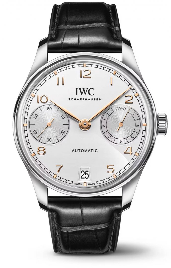IWC Schaffhausen Portugieser In-house calibre, 42.4 mm. Die Uhr hat folgende Funktionen: Datum und Energiereserve. Die Grundparameter der Uhr sind: ziffernblattfarbe ist silbern, bewegungsart ist mechanische Uhr mit automatischem Aufzug, armbandmaterial ist Leder und wasserabweisend ist 50 m.