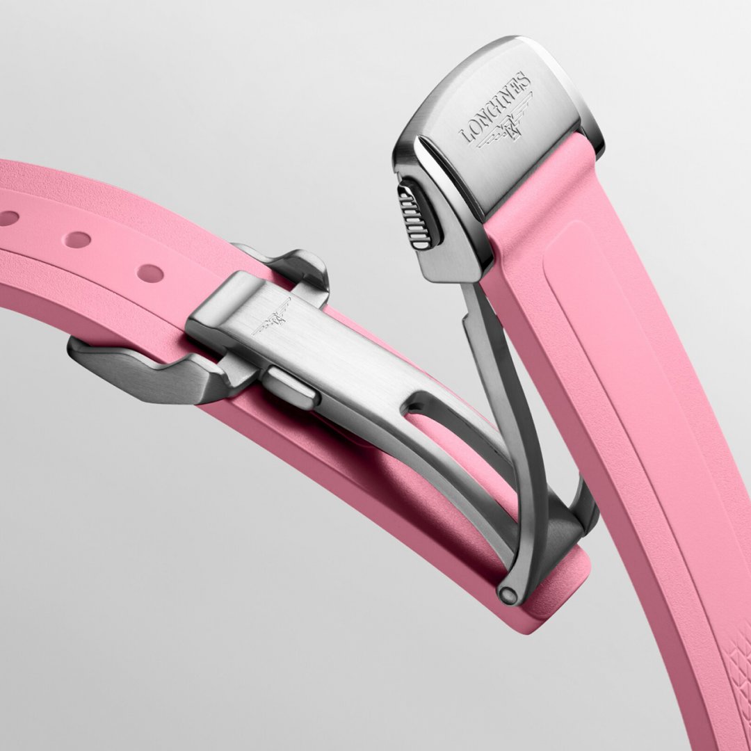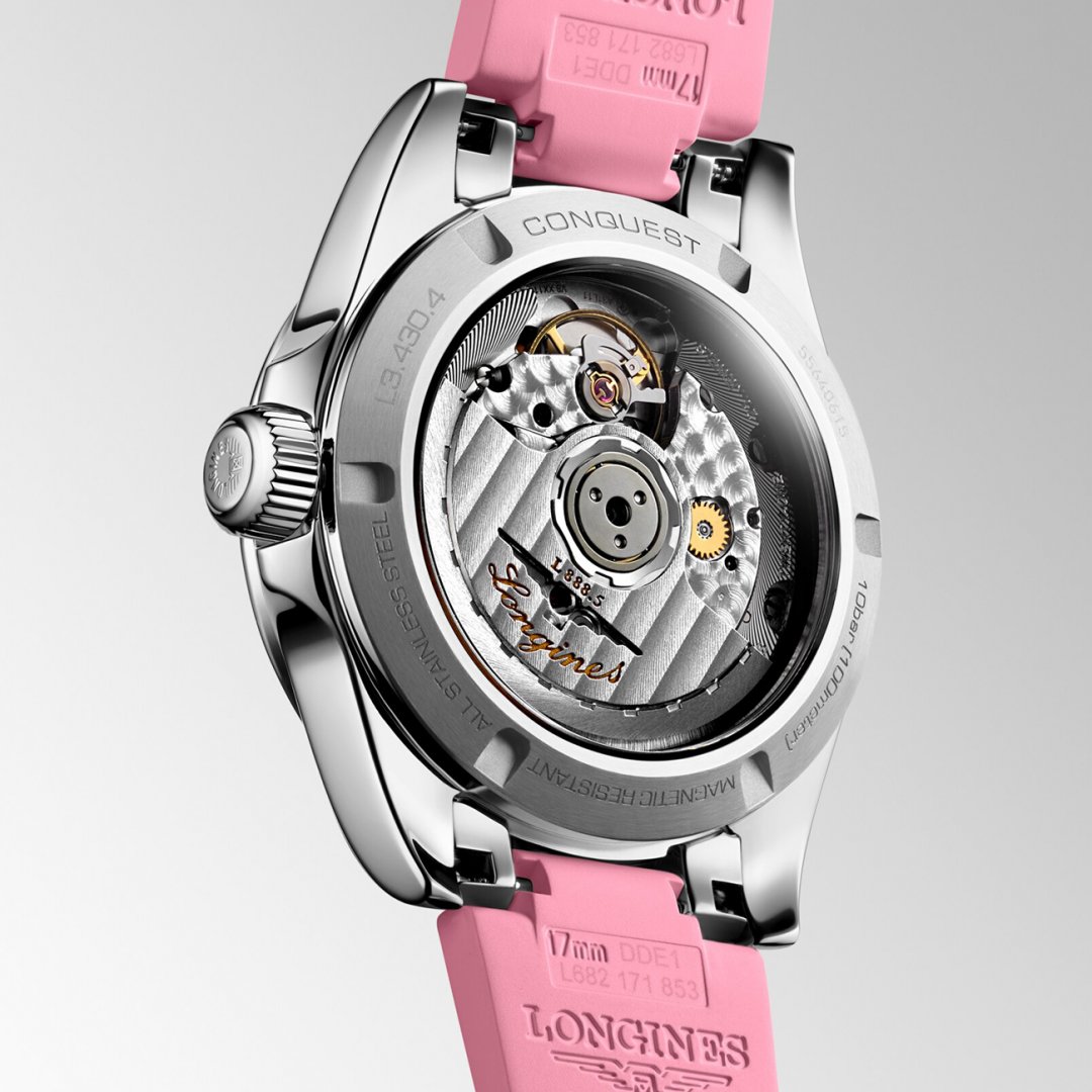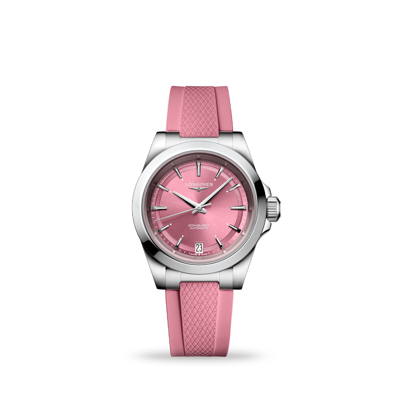Longines Conquest Automatik, 34 mm. Die Uhr hat folgende Funktionen: Datum . Die Grundparameter der Uhr sind: bewegungsart ist mechanische Uhr mit automatischem Aufzug, wasserabweisend ist 100 m, ziffernblattfarbe ist rosa und armbandmaterial ist Gummi.