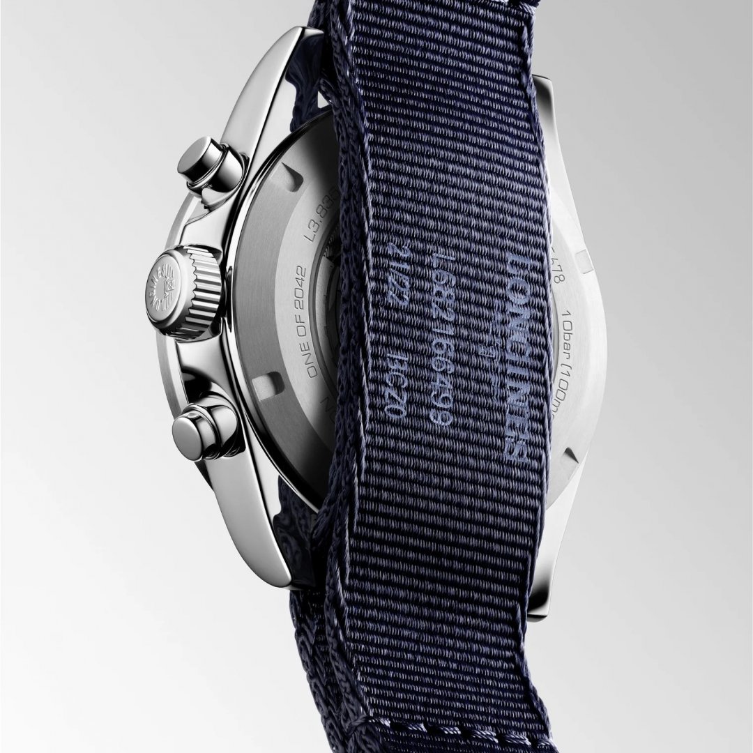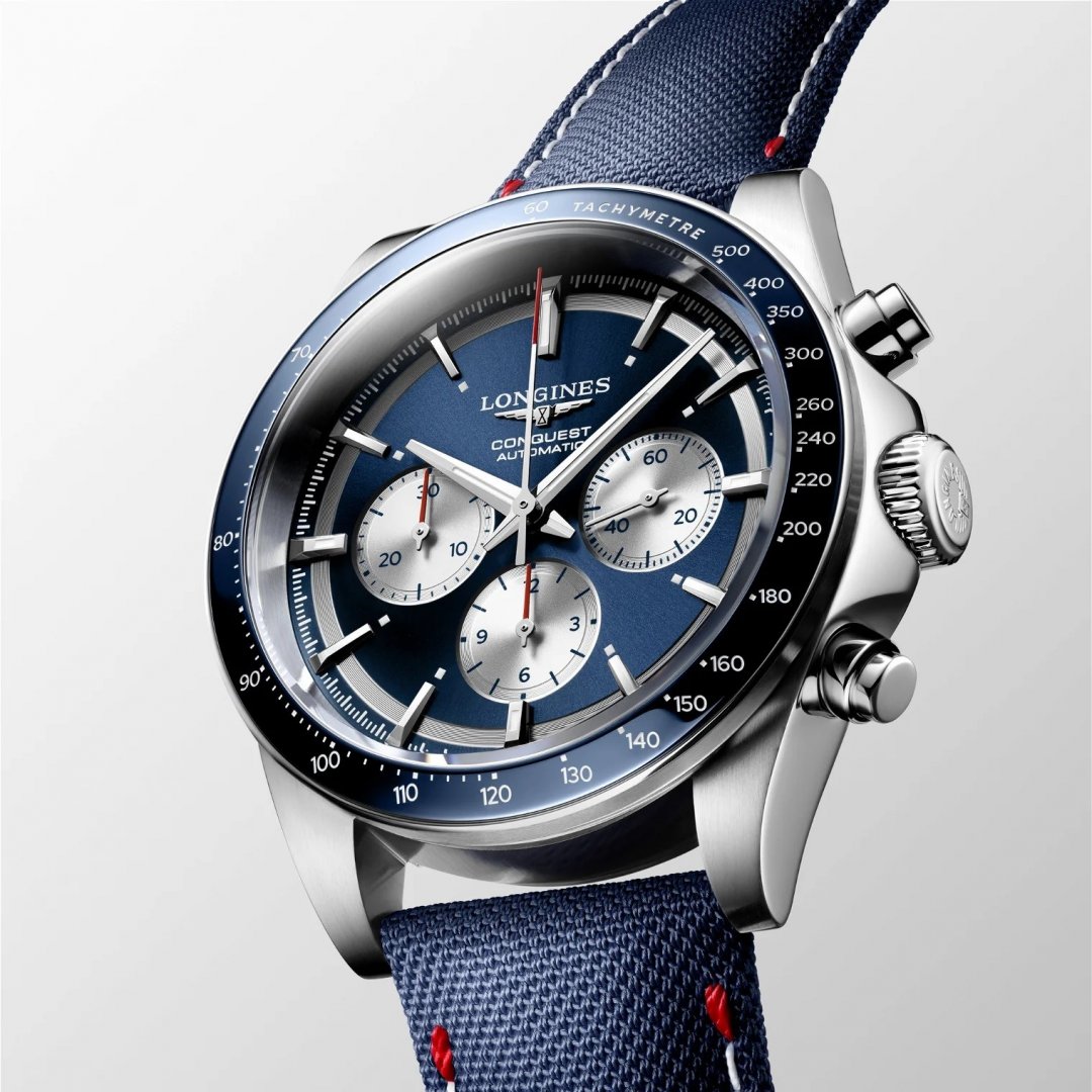 Longines Conquest Marco Odermatt Automatik Chronograf, Wasserdicht 100M, 42 mm. Die Uhr hat folgende Funktionen: Lumineszenz, Stoppuhr und Tachymeter-Skala. Die Grundparameter der Uhr sind: bewegungsart ist mechanischer Chronograph mit automatischem Aufzug, wasserabweisend ist 100 m, ziffernblattfarbe ist blau und armbandmaterial ist Leder und Textilien.