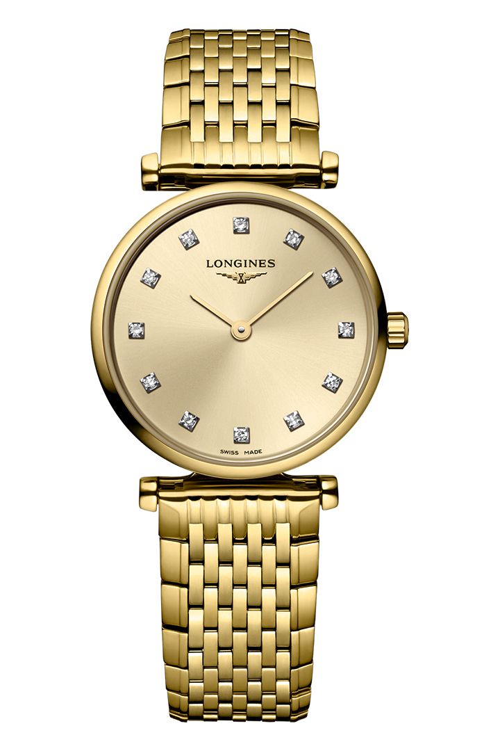 Longines La Grande Classique de Longines Diamante, Quartz, 24 mm. Die Grundparameter der Uhr sind: bewegungsart ist Quarzuhren, armbandmaterial ist Stahl, wasserabweisend ist 30 m und ziffernblattfarbe ist golden.