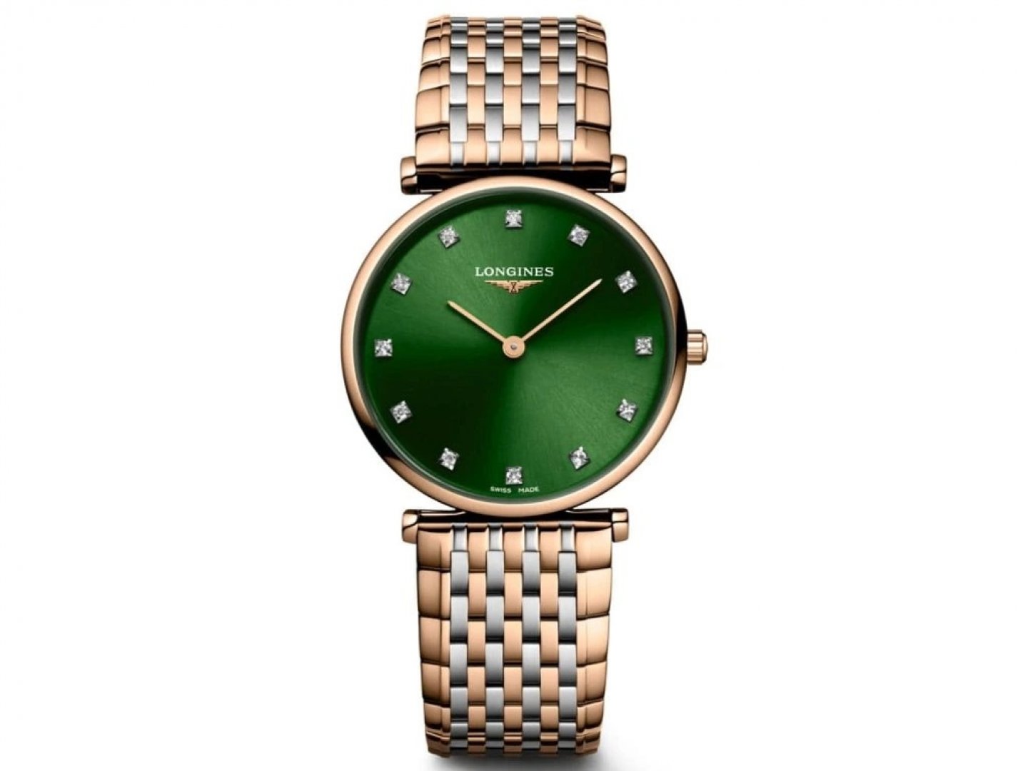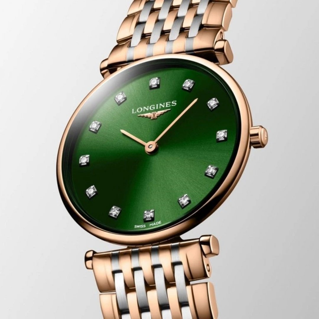 Longines La Grande Classique de Longines Diamante, Quartz, 29 mm. Die Grundparameter der Uhr sind: ziffernblattfarbe ist grün, bewegungsart ist Quarzuhren, armbandmaterial ist Stahl und wasserabweisend ist 30 m.