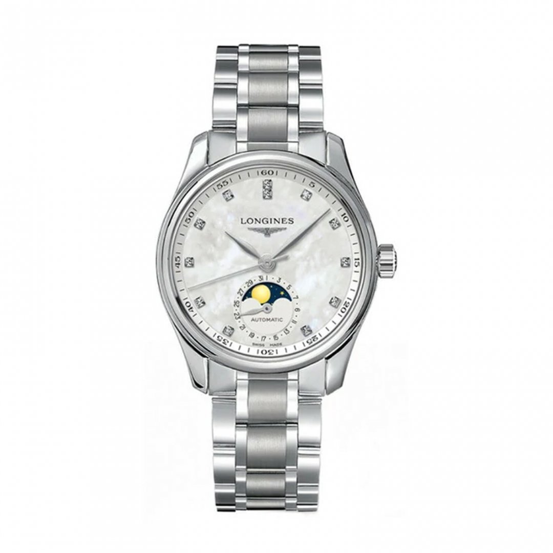 Longines Master Collection . Die Uhr hat folgende Funktionen: Mondphasen und Datum . Die Grundparameter der Uhr sind: ziffernblattfarbe ist perlmuttern, bewegungsart ist mechanische Uhr mit automatischem Aufzug, armbandmaterial ist Stahl und wasserabweisend ist 30 m.
