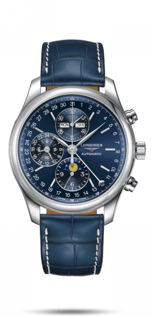 Longines Master Collection . Die Uhr hat folgende Funktionen: Datum, Mondphasen, Stoppuhr und Datum . Die Grundparameter der Uhr sind: bewegungsart ist mechanischer Chronograph mit automatischem Aufzug, armbandmaterial ist Leder, wasserabweisend ist 30 m und ziffernblattfarbe ist blau.