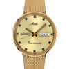 Das gemeinsame Merkmal der Commander 1959 Modelle ist das Monocoque-Gehäuse, das die Robustheit der Uhr erhöht. Das Gehäuse besteht aus Edelstahl mit Gelbgold-PVD-Beschichtung. Neben dem Mido-Logo im Vintage-Stil trägt das Zifferblatt auch das Emblem der Commander-Serie. Die Wochentags- und Datumsanzeige befindet sich auf der 3-Uhr-Position.