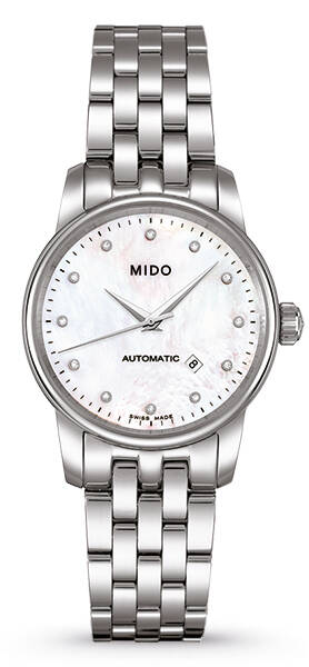 Mido Baroncelli . Die Uhr hat folgende Funktionen: Datum . Die Grundparameter der Uhr sind: bewegungsart ist mechanische Uhr mit automatischem Aufzug, wasserabweisend ist 50 m, ziffernblattfarbe ist perlmuttern und armbandmaterial ist Stahl.