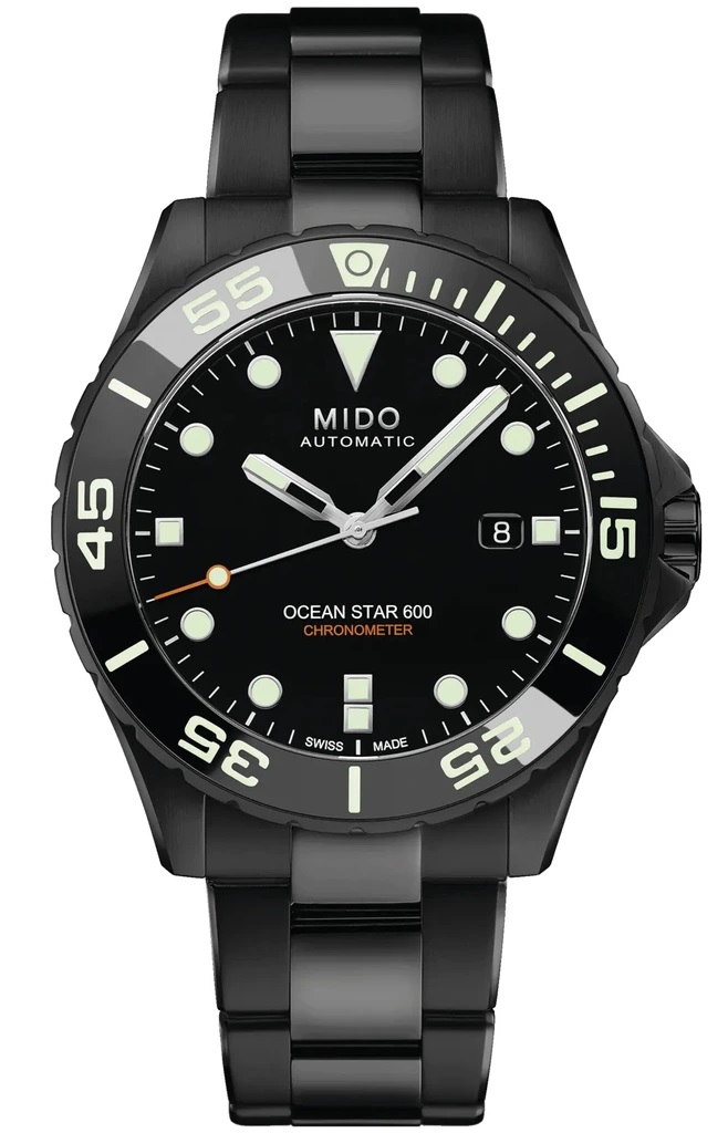 Mido Ocean Star 600 Chronometer Powermatic 80, Wasserdicht 600M, 43.50 mm. Die Uhr hat folgende Funktionen: Helium-Ablassventil, Lumineszenz und Datum . Die Grundparameter der Uhr sind: bewegungsart ist mechanische Uhr mit automatischem Aufzug und chronometer, armbandmaterial ist Stahl und Gummi, wasserabweisend ist 600 m und ziffernblattfarbe ist schwarz.