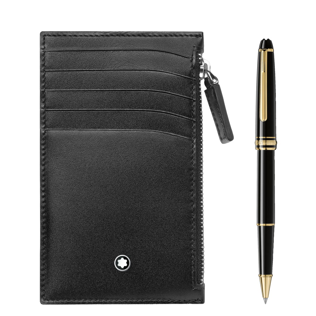 Set mit Meisterstück platinbeschichtetem Classique Rollerball und Meisterstück Pocket 5cc mit Reißverschluss. Die Kappe und der Korpus sind aus schwarzem Edelharz gefertigt und mit dem kultigen weißen Montblanc Emblem auf der Kappenspitze versehen. Das Meisterstück pocket 5cc mit Reißverschluss ist aus schwarzem Leder mit dem Montblanc Tiefenglanz gefertigt. Sie bietet 5 Kreditkartenfächer und ein langes Reißverschlussfach und ist damit ein kompakter täglicher Begleiter.