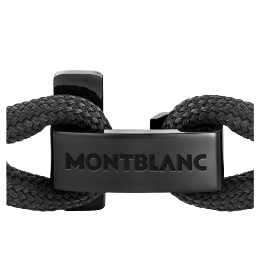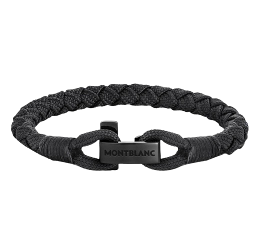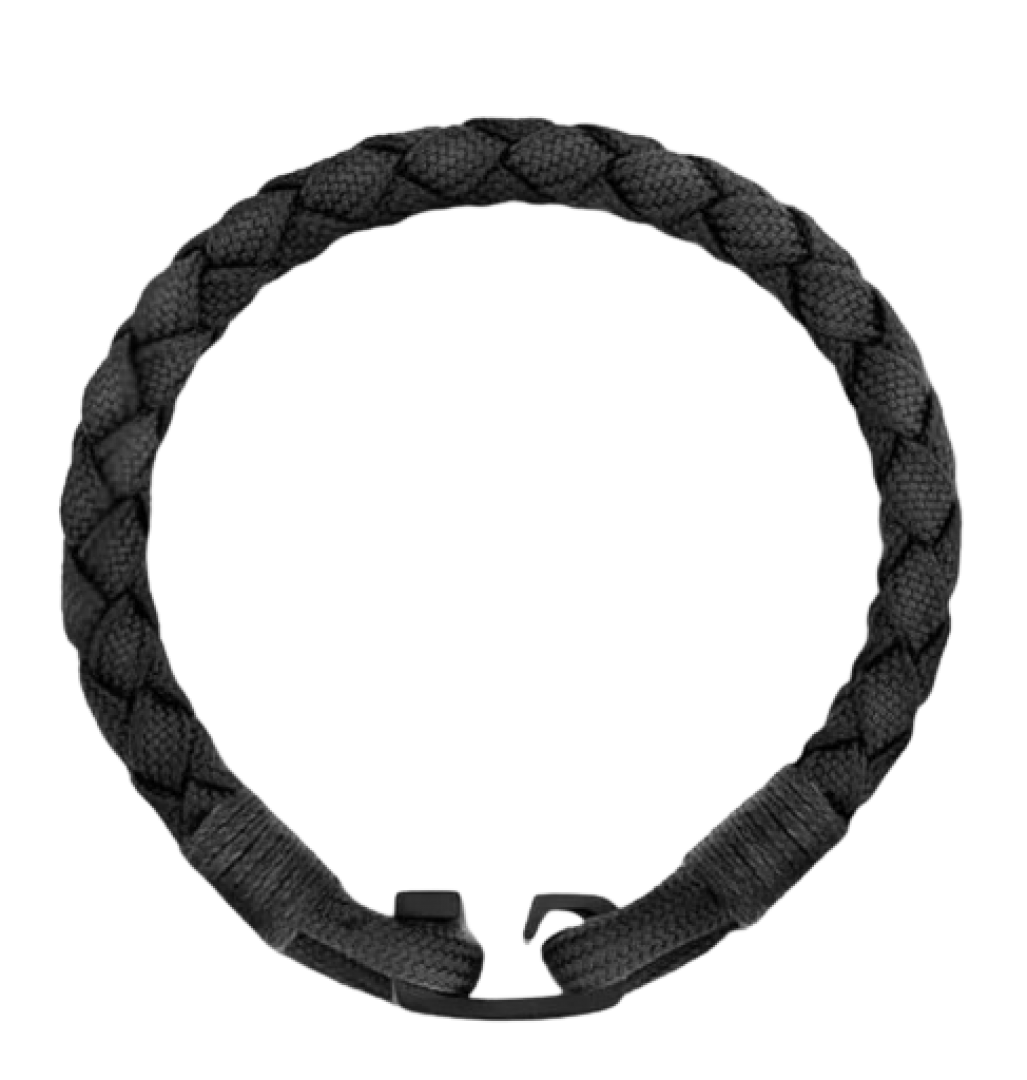 Dieses Schmuckstück hat ein schwarzes Nylongewebe und einen T-Haken aus rostfreiem Stahl mit schwarzer PVD-Beschichtung.
