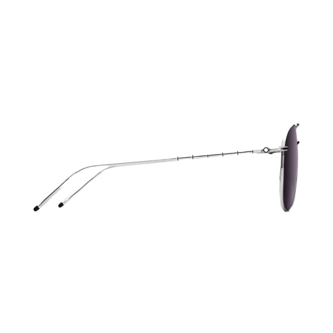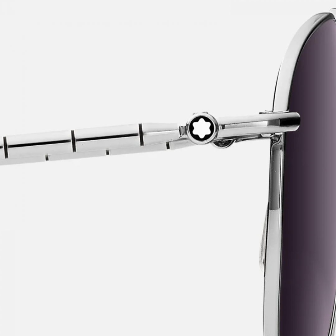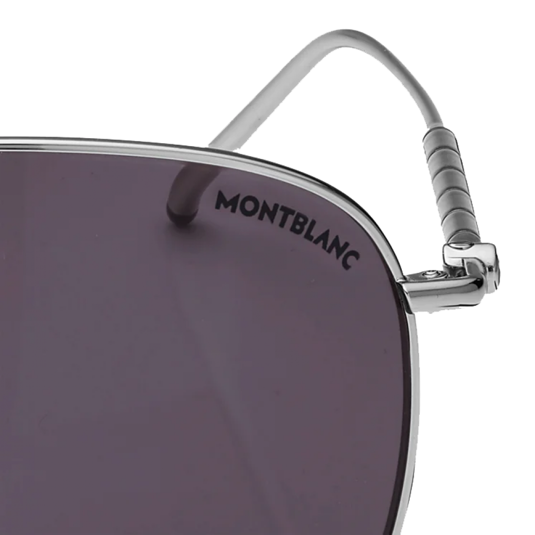 Diese Sonnenbrille im quadratischen Stil hat einen silberfarbenen Metallrahmen und grau getönte Gläser. Das Montblanc Emblem in Form einer Schneekappe ist in die aus mehreren Zylindern bestehenden Bügel eingearbeitet. Die Endstücke sind mit schwarzer Emaille versehen und das Montblanc Logo ist auf das linke Glas gelasert.