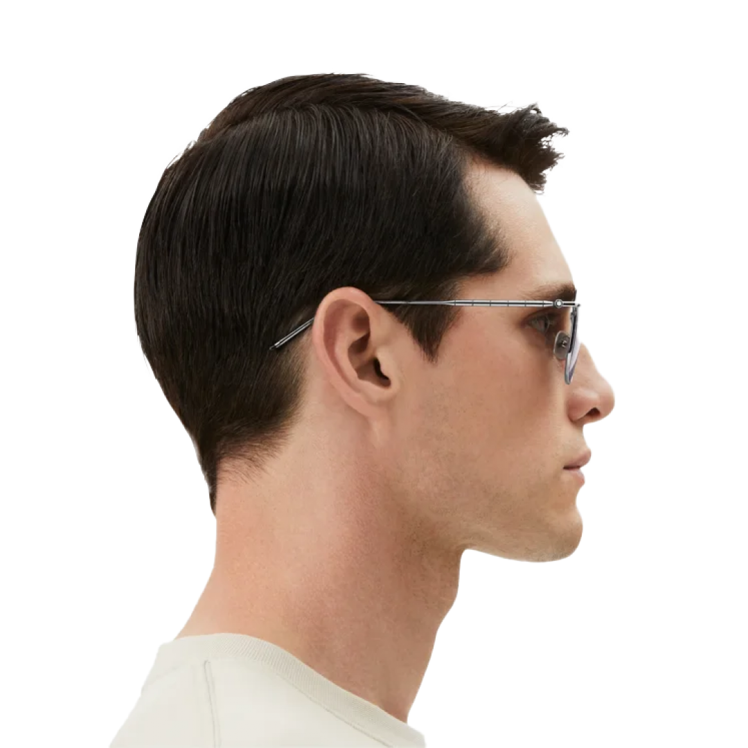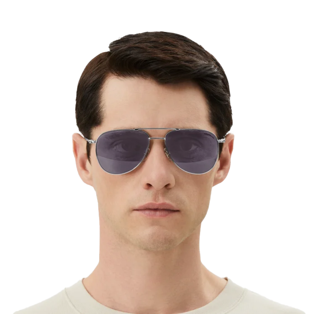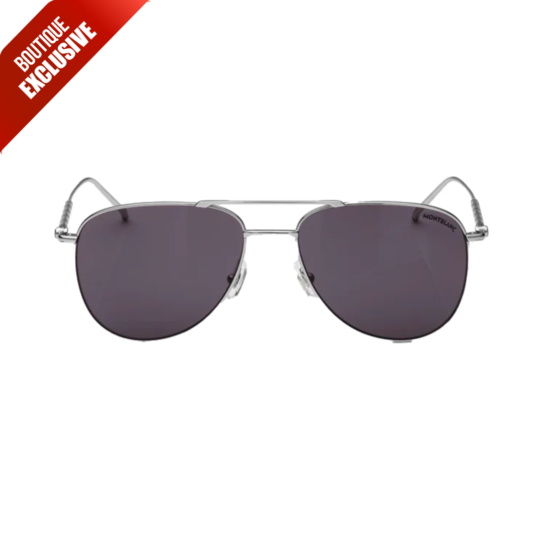 Diese Sonnenbrille im quadratischen Stil hat einen silberfarbenen Metallrahmen und grau getönte Gläser. Das Montblanc Emblem in Form einer Schneekappe ist in die aus mehreren Zylindern bestehenden Bügel eingearbeitet. Die Endstücke sind mit schwarzer Emaille versehen und das Montblanc Logo ist auf das linke Glas gelasert.