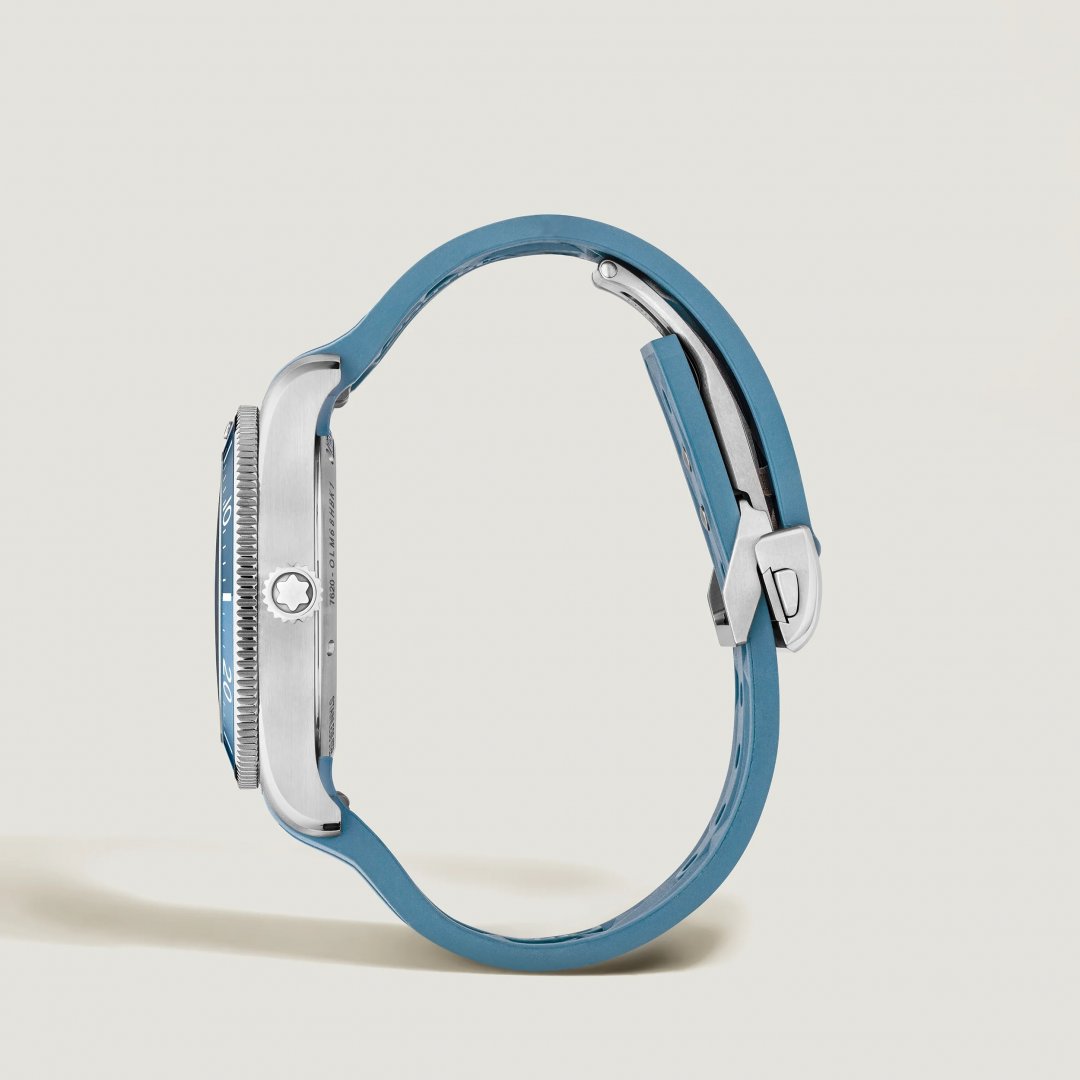 Die Montblanc Iced Sea Automatic Date 0 Oxygen mit blauem Zifferblatt mit Sfumato-Gletschermuster vermittelt den Eindruck, in die Tiefen eines Gletschers zu blicken. Inspiriert vom Mer de Glace wurde seine eisige Textur mithilfe einer nahezu in Vergessenheit geratenen Technik erhalten, dem „gratté-boisé“. Die Uhr ist in einem 38 mm großen Edelstahlgehäuse untergebracht, das völlig sauerstofffrei ist, und verfügt über eine einseitig drehbare Lünette mit zweifarbigem Einsatz aus blauem eloxiertem Aluminium, eine 3D-Gravur auf dem Gehäuseboden und ein austauschbares blaues Kautschukarmband mit Feineinstellung. Die Uhr erfüllt die Anforderungen der ISO 6425 Norm für Gerätetauchen und ist wasserdicht bis 300 Meter.