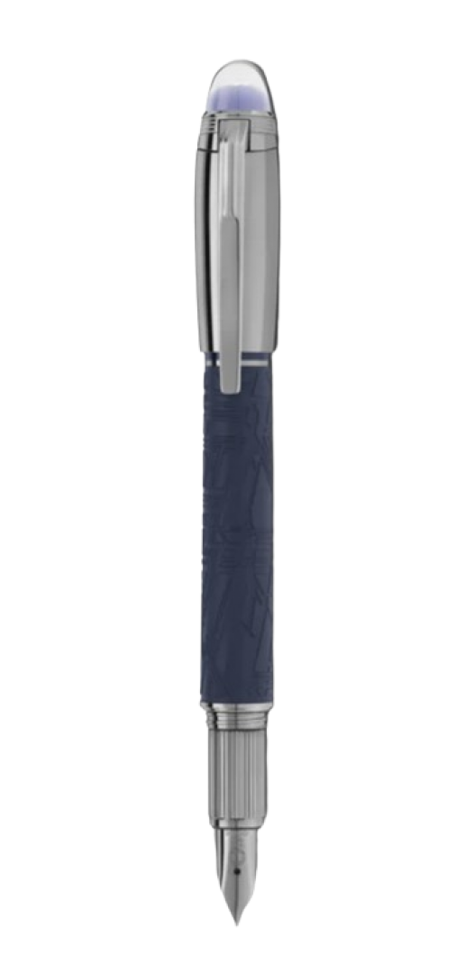 Der Starwalker SpaceBlue blickt über den Planeten Erde hinaus und wendet sich den Sternen und der Galaxie zu. Äußerst maskulin und futuristisch bringt diese neue StarWalker-Kollektion ein neues Aussehen für das Harzfass, mit einem Design, das an die komplizierten Strukturen des Widmanstätten-Musters erinnert, eine der hypnotischsten Kreationen der Natur. Die Metallkappe und die Beschläge sind mit dunklem Ruthenium beschichtet, begleitet von einem tiefen Weltraumblau-Ton für das matte Edelharz, das die Farbtöne eines sternenklaren Himmels widerspiegelt. Auch die Subkuppel auf der Kappenspitze, über der das Montblanc-Emblem schwebt, kommt in einem tiefen Weltraumblau. Der Füllfederhalter ist handgefertigt mit einer rutheniumbeschichteten Au585 Goldfeder.
