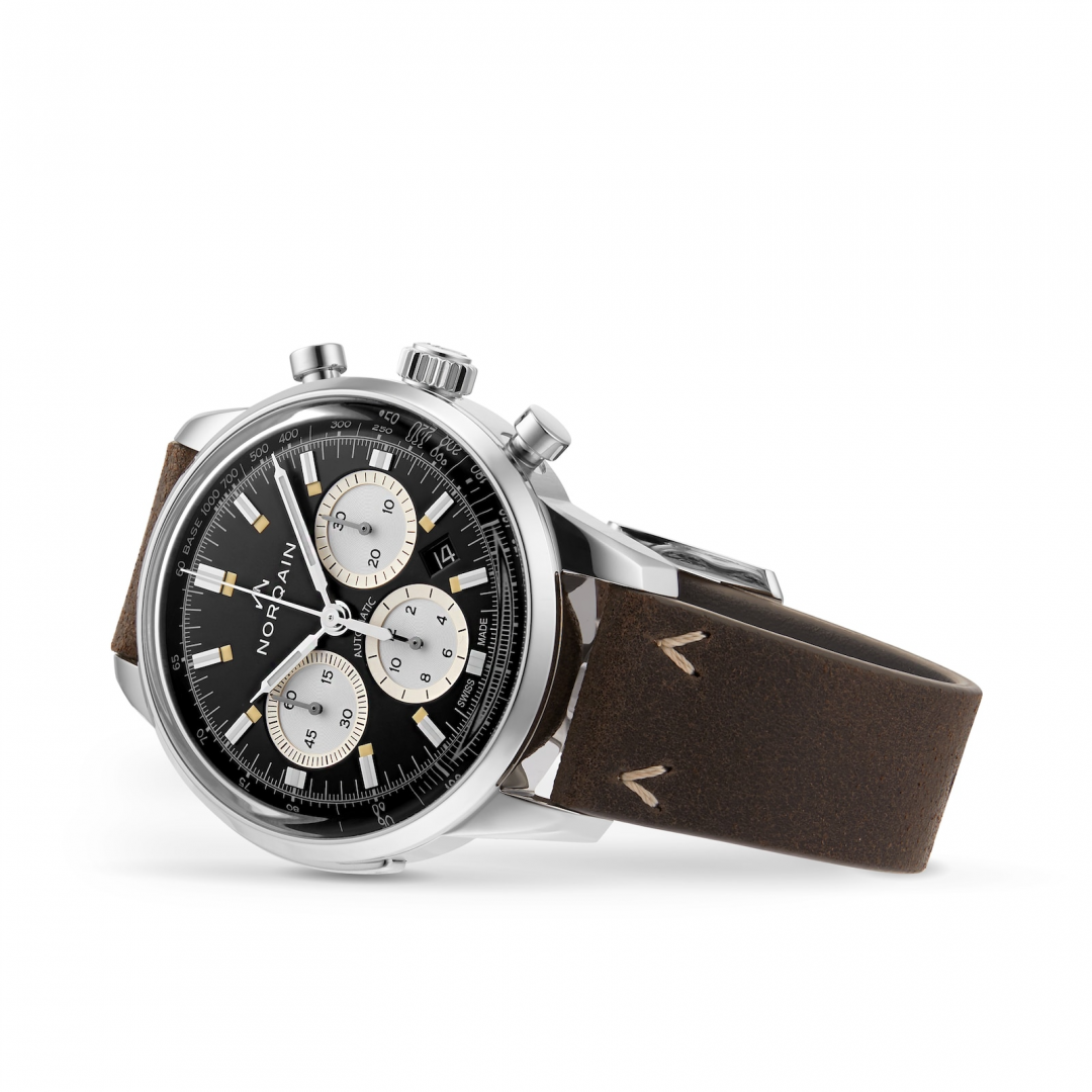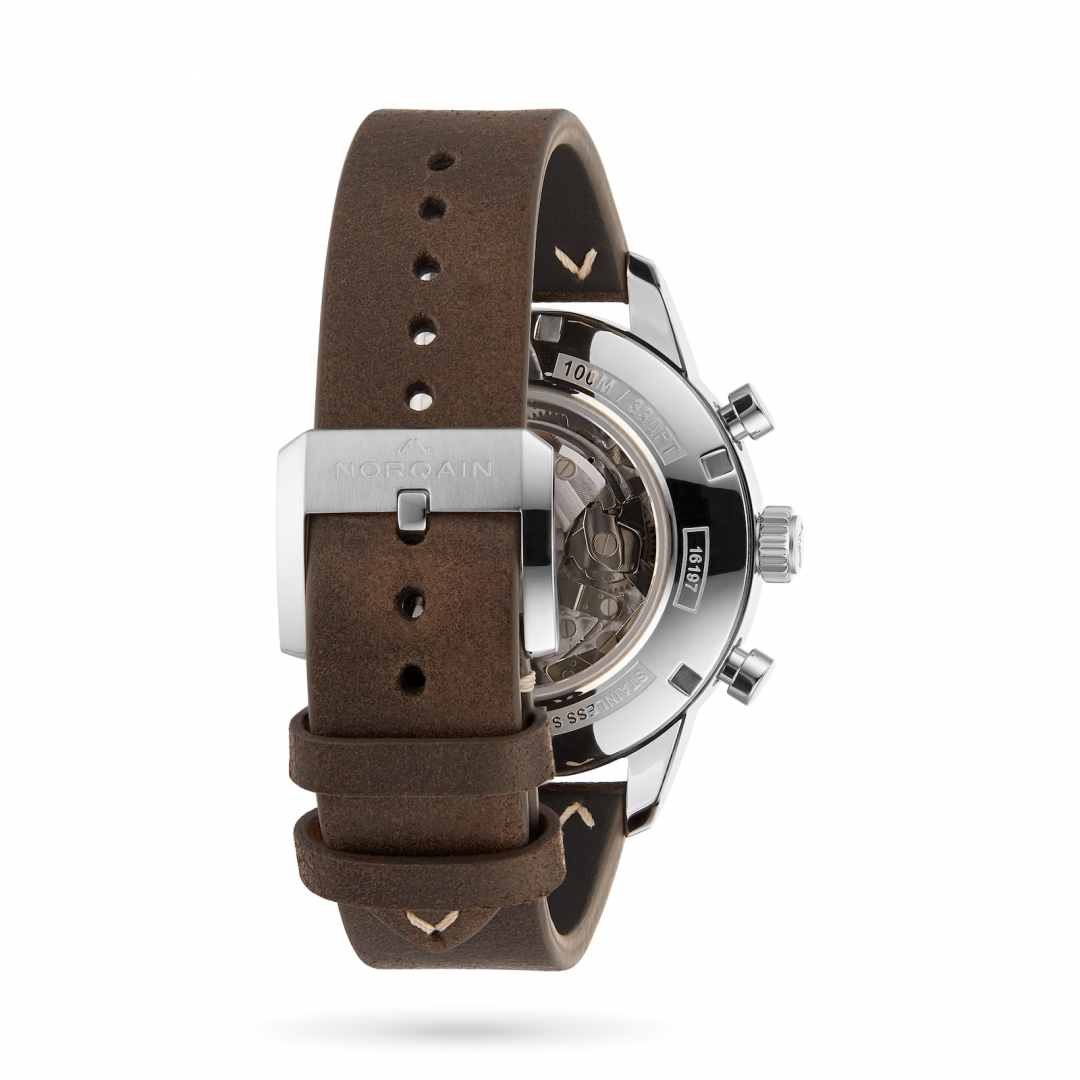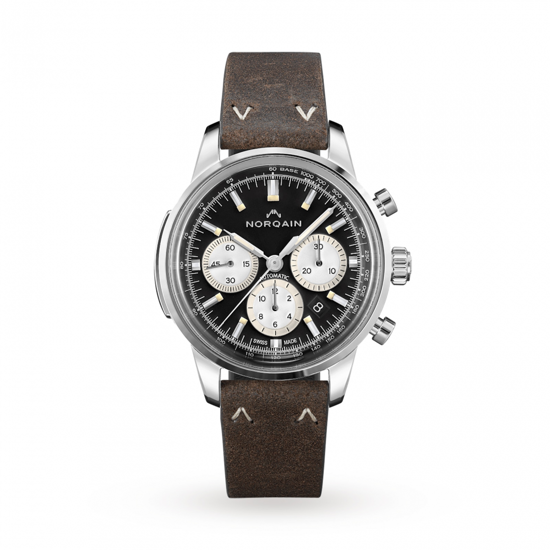Norquain FREEDOM Automatisch, 43 mm. Die Uhr hat folgende Funktionen: Lumineszenz, Stoppuhr und Datum . Die Grundparameter der Uhr sind: ziffernblattfarbe ist schwarz, bewegungsart ist mechanischer Chronograph mit automatischem Aufzug, armbandmaterial ist Leder und wasserabweisend ist 100 m.