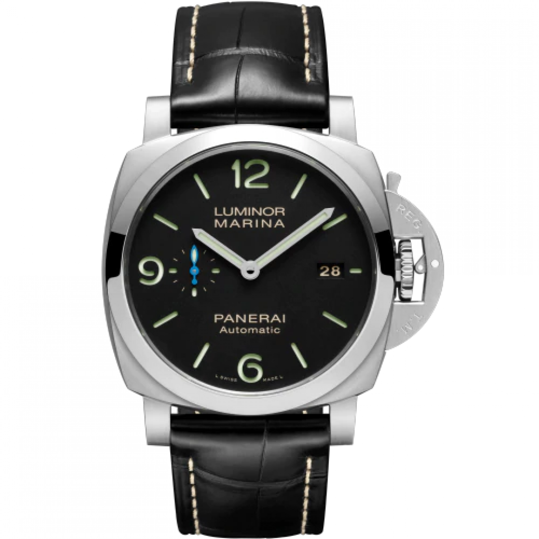 Panerai Luminor Marina . Die Uhr hat folgende Funktionen: Lumineszenz und Datum . Die Grundparameter der Uhr sind: ziffernblattfarbe ist schwarz, bewegungsart ist mechanische Uhr mit automatischem Aufzug, armbandmaterial ist Leder und wasserabweisend ist 300 m.