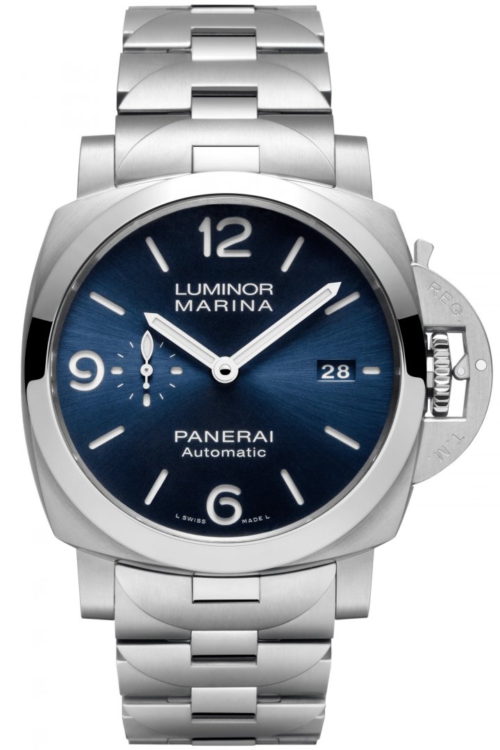 Panerai Luminor Marina Specchio Blu . Die Uhr hat folgende Funktionen: Lumineszenz und Datum . Die Grundparameter der Uhr sind: wasserabweisend ist 300 m, ziffernblattfarbe ist blau, bewegungsart ist mechanische Uhr mit automatischem Aufzug und armbandmaterial ist Stahl.
