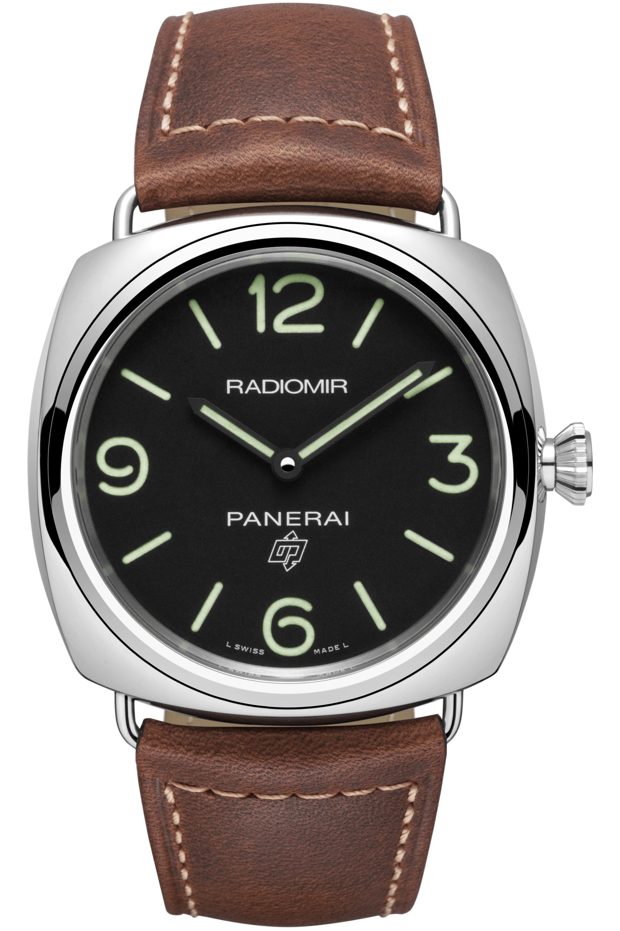 Panerai Radiomir Base Logo Mechanik, Wasserdicht 100M, 45 mm. Die Uhr hat folgende Funktionen: Lumineszenz. Die Grundparameter der Uhr sind: ziffernblattfarbe ist braun, bewegungsart ist mechanische Uhr mit Handaufzug , armbandmaterial ist Leder und wasserabweisend ist 100 m.