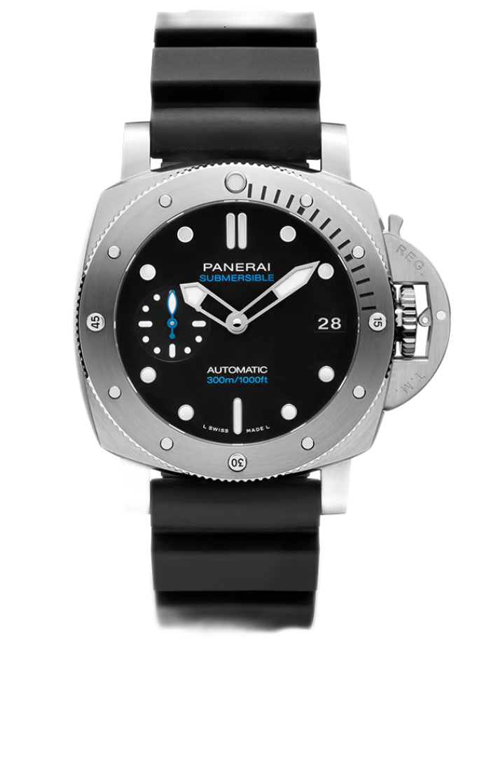 Panerai Submersible In-house movement, Wasserdicht 300M, 42 mm. Die Uhr hat folgende Funktionen: Lumineszenz und Datum . Die Grundparameter der Uhr sind: ziffernblattfarbe ist schwarz, bewegungsart ist mechanische Uhr mit automatischem Aufzug, armbandmaterial ist Gummi und wasserabweisend ist 300 m.