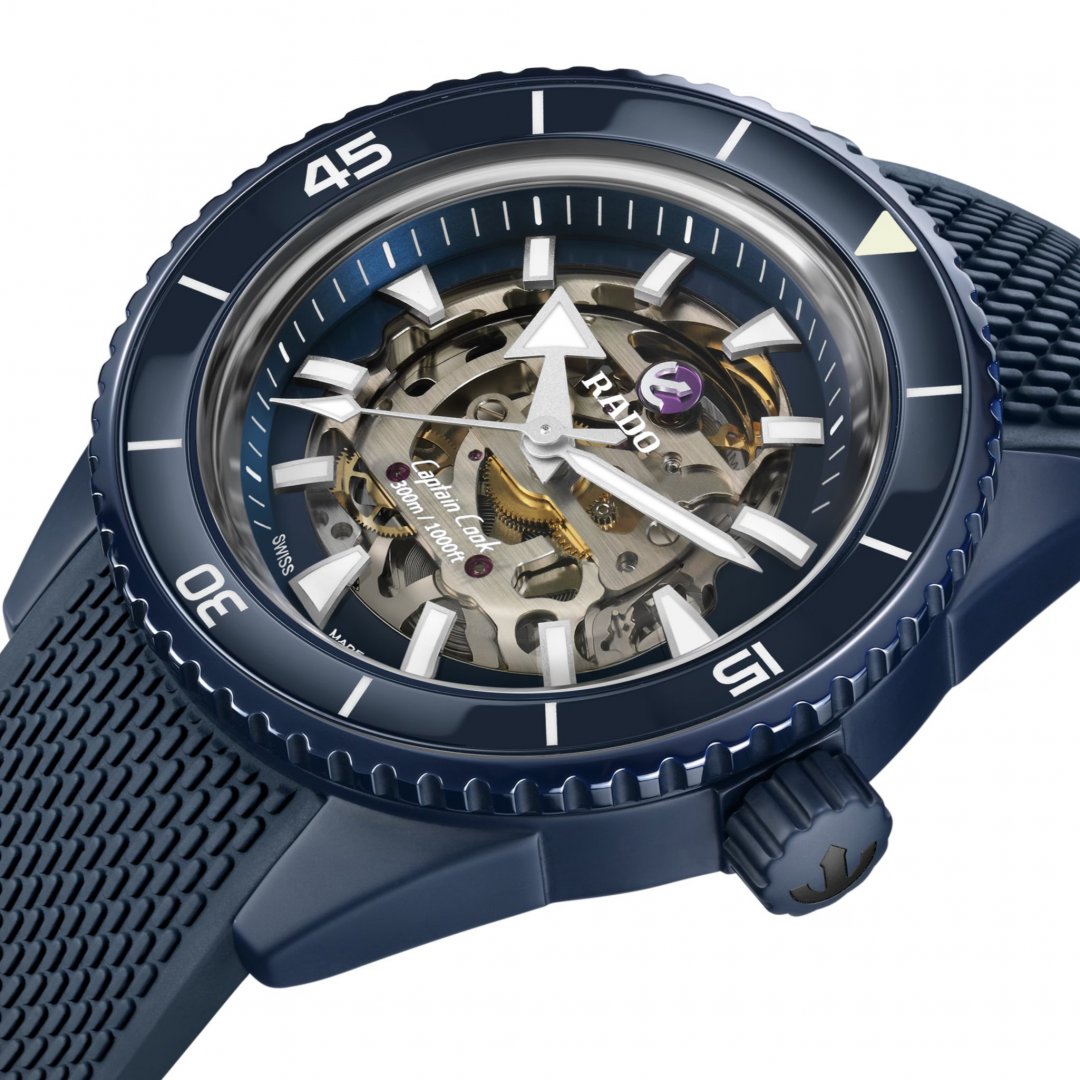 Rado Captain Cook High-Tech Ceramic Skeleton Automatik, Wasserdicht 300M, 43 mm. Die Uhr hat folgende Funktionen: Lumineszenz. Die Grundparameter der Uhr sind: ziffernblattfarbe ist transparent, bewegungsart ist mechanische Uhr mit automatischem Aufzug, wasserabweisend ist 300 m und armbandmaterial ist Gummi.