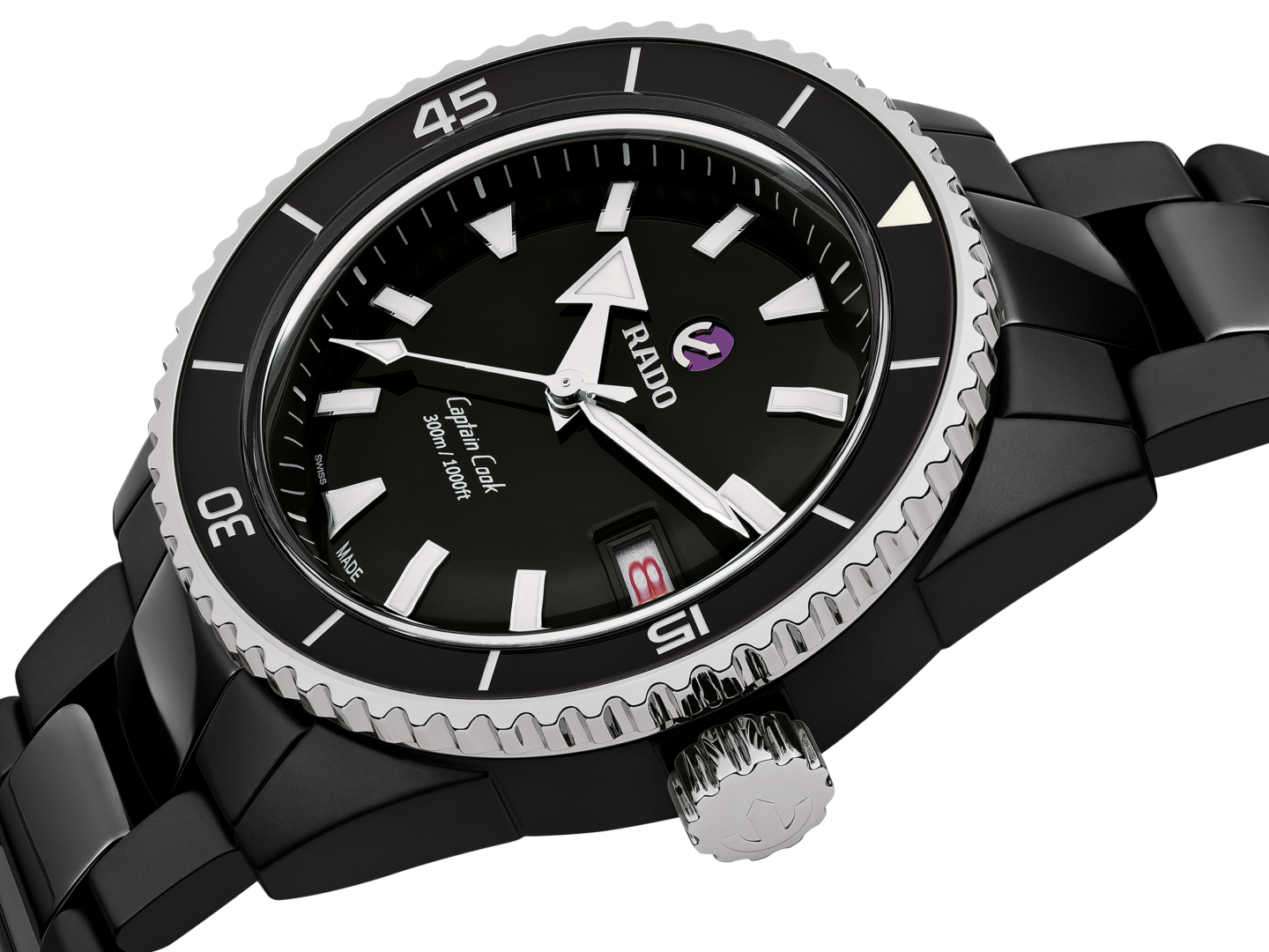 Die Captain Cook High-Tech Ceramic Diver Uhr ist wasserdicht bis 300 m. Die Zeiger und Indizes der nach ISO 6425 zertifizierten Taucheruhr sind mit SuperLuminova® beschichtet, um eine hervorragende Sichtbarkeit auf dem schwarz lackierten und polierten Zifferblatt zu gewährleisten. Das 43-mm-Monobloc-Gehäuse besteht aus mattschwarzer Hightech-Keramik, während die drehbare Lünette aus gehärtetem, poliertem Edelstahl besteht. Im Inneren übertrifft das Automatikwerk Rado R763 die Standardanforderungen für Genauigkeitstests von 3 bis 5 Positionen und bietet 80 Stunden Gangreserve. Dieses Modell wird mit einem polierten, schwarzen Hightech-Keramikarmband geliefert. Was auch immer Ihr Forschungsgebiet ist, Ihr Captain Cook High-Tech Ceramic Diver wird Ihnen viele Jahre lang ein zuverlässiger und solider Partner sein.