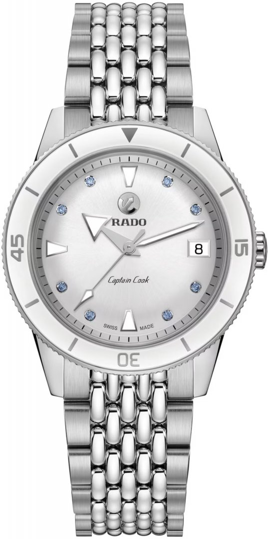 Rado Captain Cook Automatik, 37 mm. Die Uhr hat folgende Funktionen: Lumineszenz und Datum . Die Grundparameter der Uhr sind: ziffernblattfarbe ist silbern, bewegungsart ist mechanische Uhr mit automatischem Aufzug, armbandmaterial ist Leder, Stahl und Textilien und wasserabweisend ist 100 m.