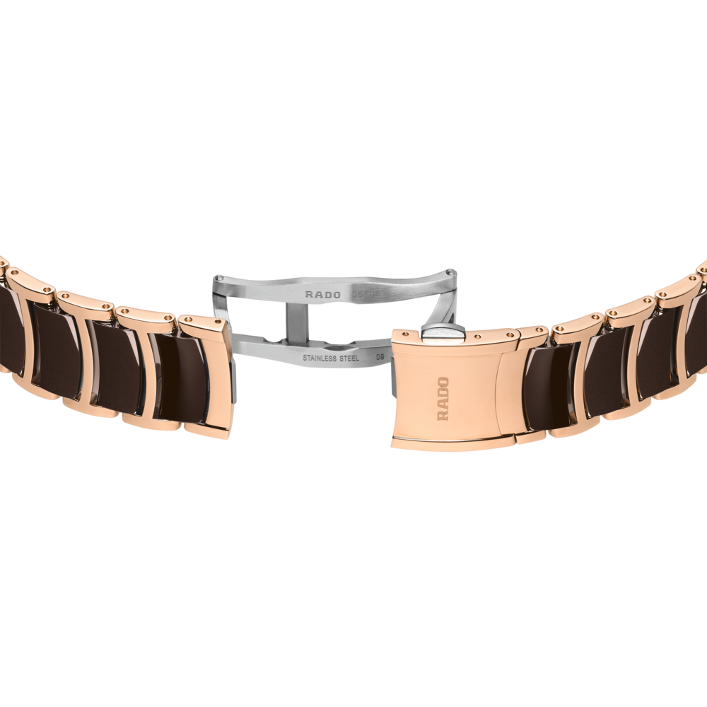 • Armband: polierter Stahl mit braunen Keramikgliedern, Dreifachschließe.