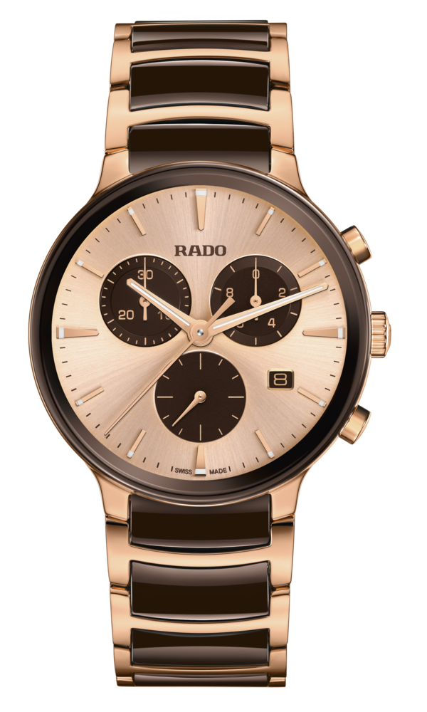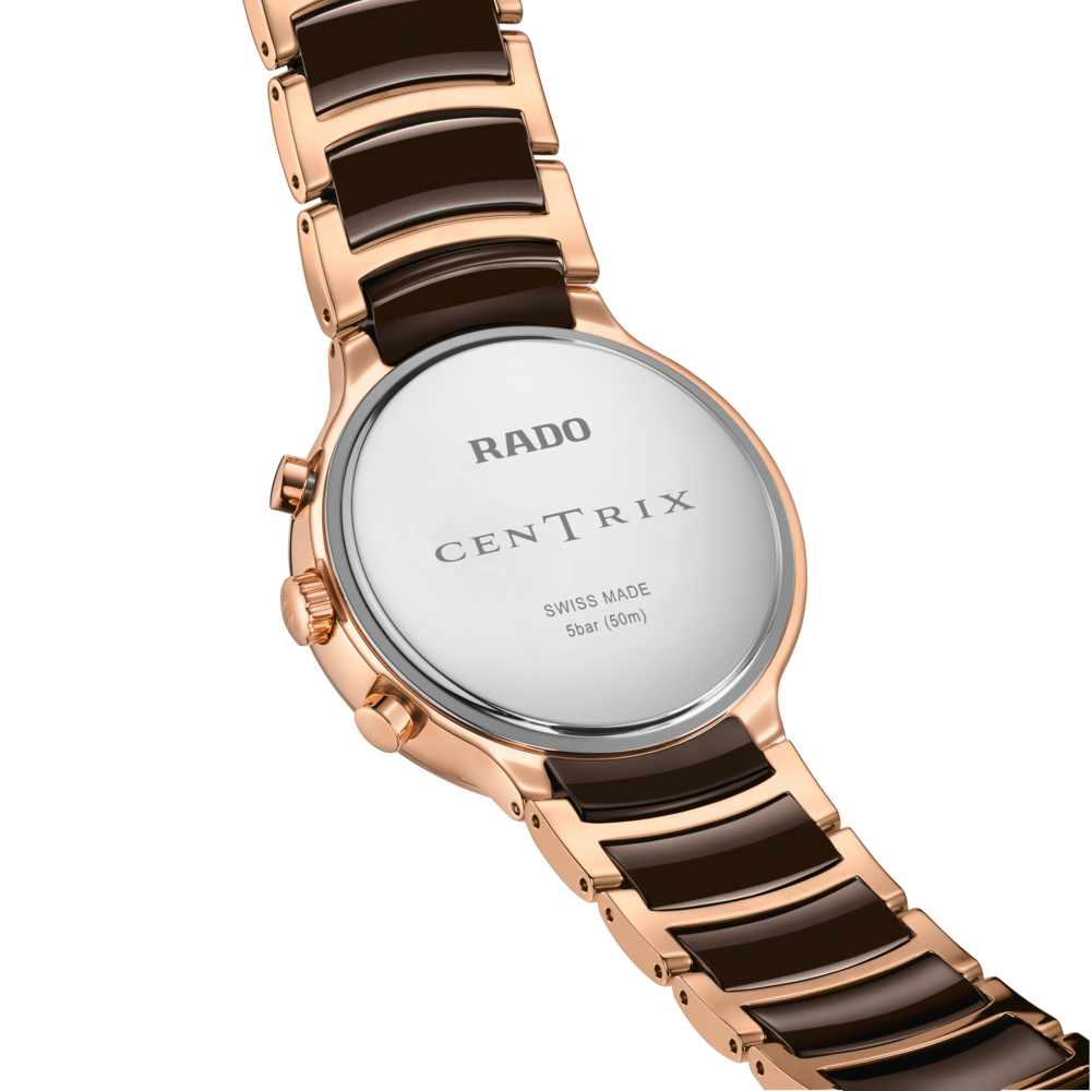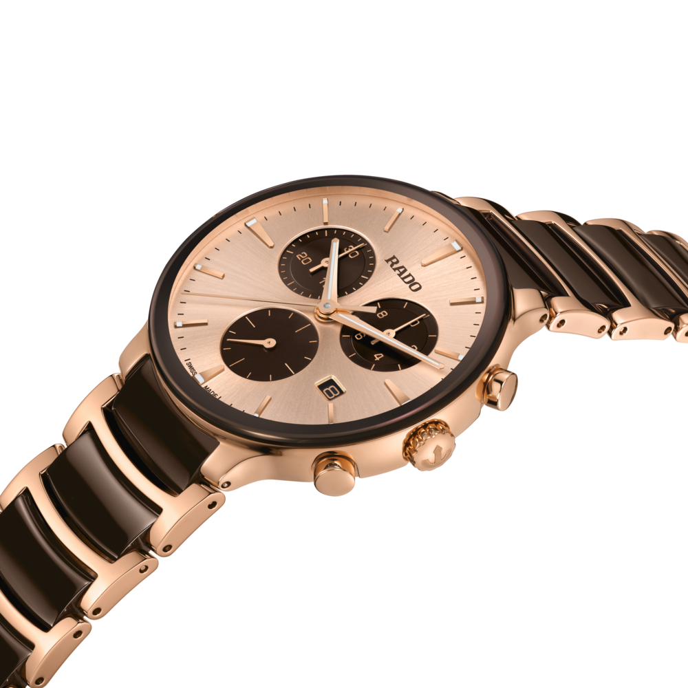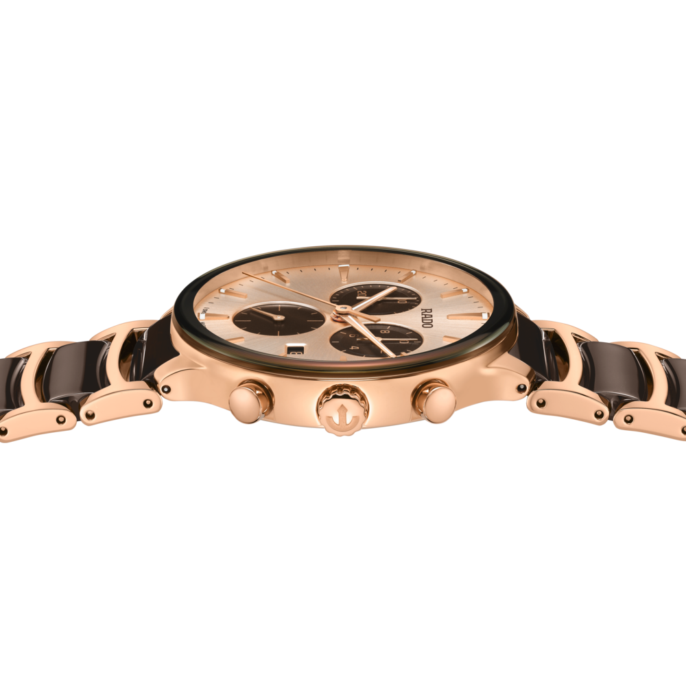 Das Modell Centrix Chronograph R30212402 stellt eine perfekte Harmonie zwischen künstlerischem Design und technischer Perfektion dar. Dank der Kombination aus Edelstahl mit PVD-Beschichtung in Roségold und Details aus Hightech-Keramik verkörpert dieser Chronograph Luxus und Komfort.