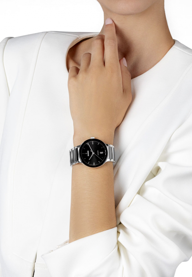 Die klassische Centrix Automatic wurde nicht nur technisch, sondern auch ästhetisch überarbeitet. Das modifizierte Modell hat ein abgerundetes Saphirglas, das bis zum Rand reicht, und das gewölbte Gehäuse geht in die gewölbte Kristalllünette über. Eingelassene Bandanstöße und ein poliertes Edelstahlarmband mit schwarzen Hightech-Keramikgliedern in der Mitte vervollständigen das Gesamtbild dieses kultigen Zeitmessers. Das schwarze Sonnenschliff-Zifferblatt mit rhodinierten Indexen passt perfekt zu den rhodinierten Zeigern. Im Inneren übertrifft das Dreizeigerwerk des Kalibers R763 dank der antimagnetischen Nivachron™-Spirale die Anforderungen der Standard-Genauigkeitsprüfungen von 3 bis 5 Positionen, was die Zuverlässigkeit und Genauigkeit erhöht. Die Uhr ist bis 50 m wasserdicht und bietet eine Gangreserve von 80 Stunden.