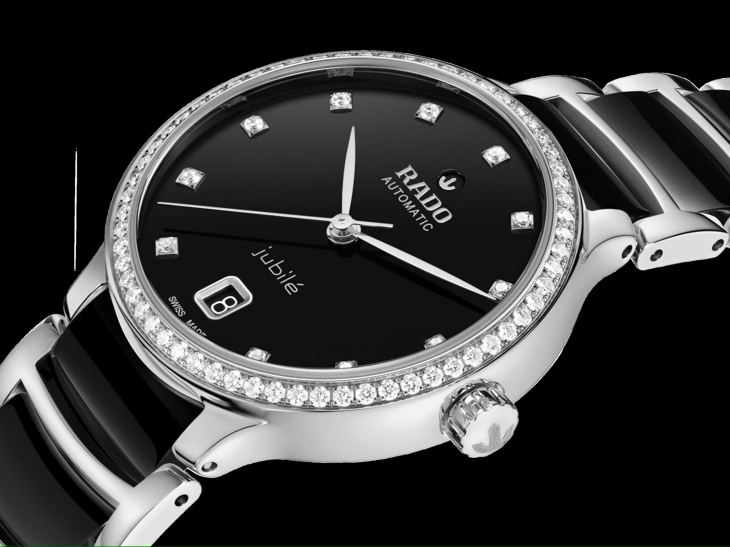 Erleben Sie die harmonische Verbindung von künstlerischem Ausdruck und raffiniertem Design mit der Centrix Super Jubile. Das 35-mm-Gehäuse aus Edelstahl wird von einer Edelstahllünette gekrönt, die mit 60 Top Wesselton VS-SI-Diamanten im Vollschliff besetzt ist, und einem gewölbten, beidseitig entspiegelten Saphirglas, das eine einwandfreie Ablesbarkeit gewährleistet. In ihrem Herzstück, das durch den Saphirglasboden sichtbar ist, schlägt das fein justierte Automatikkaliber R763, das in fünf Positionen reguliert wird und mit einer Nivachron™-Spirale ausgestattet ist, die für außergewöhnliche Ganggenauigkeit und eine beeindruckende Gangreserve von 80 Stunden sorgt. Das schwarz lackierte Zifferblatt mit 11 Top Wesselton VS-SI Vollschliff-Diamantindexen und einem Datumsfenster bei 6 Uhr strahlt zeitlose Eleganz aus. Abgerundet wird das Gesamtbild dieses kultigen Zeitmessers durch elegant angepasste Gehäuseansätze und ein Armband aus poliertem Edelstahl mit schwarzen Hightech-Keramik-Mittelgliedern, das mit einer Dreifach-Edelstahlschließe geschlossen wird.