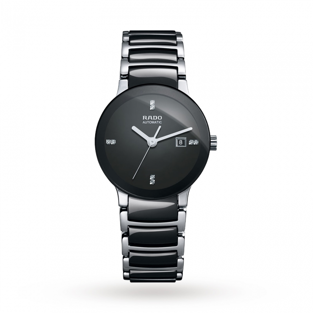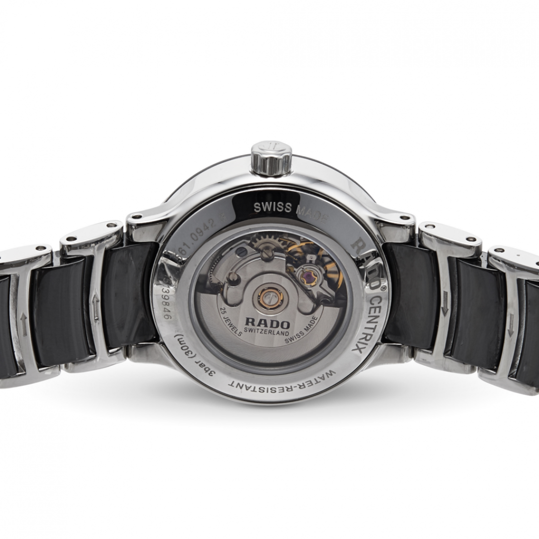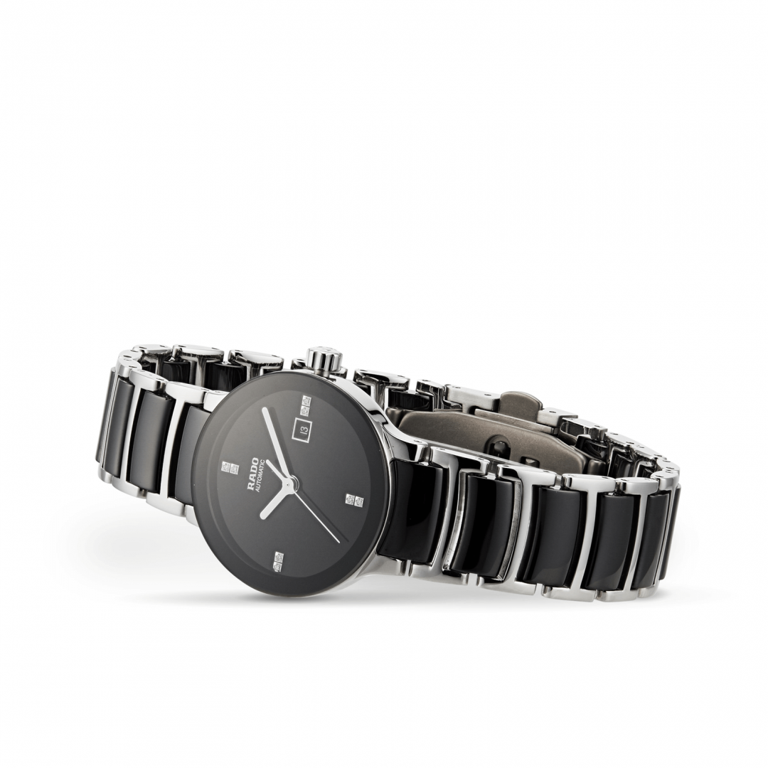 Damen luxus- uhr Rado Centrix 28mm Stahlgehäuse mit Stahl-Keramikschließe. Die Uhr hat folgende Funktionen: Datum . Die Grundparameter der Uhr sind: ziffernblattfarbe ist schwarz, armbandmaterial ist kerámia und acél, wasserabweisend ist 30 m und bewegungsart ist mechanische Uhr mit automatischem Aufzug.