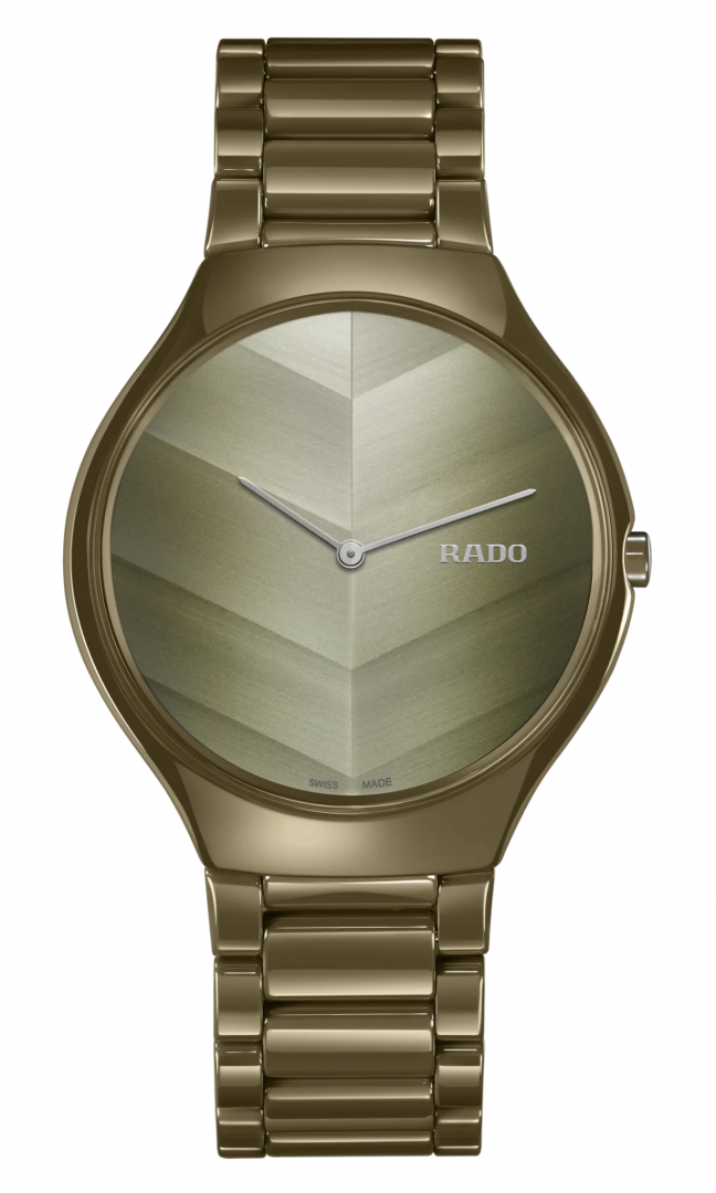 Rado True Thinline x Great Gardens of the World Keramik, Quartz, 39 mm. Die Grundparameter der Uhr sind: bewegungsart ist Quarzuhren, armbandmaterial ist Keramik, wasserabweisend ist 30 m und ziffernblattfarbe ist braun.