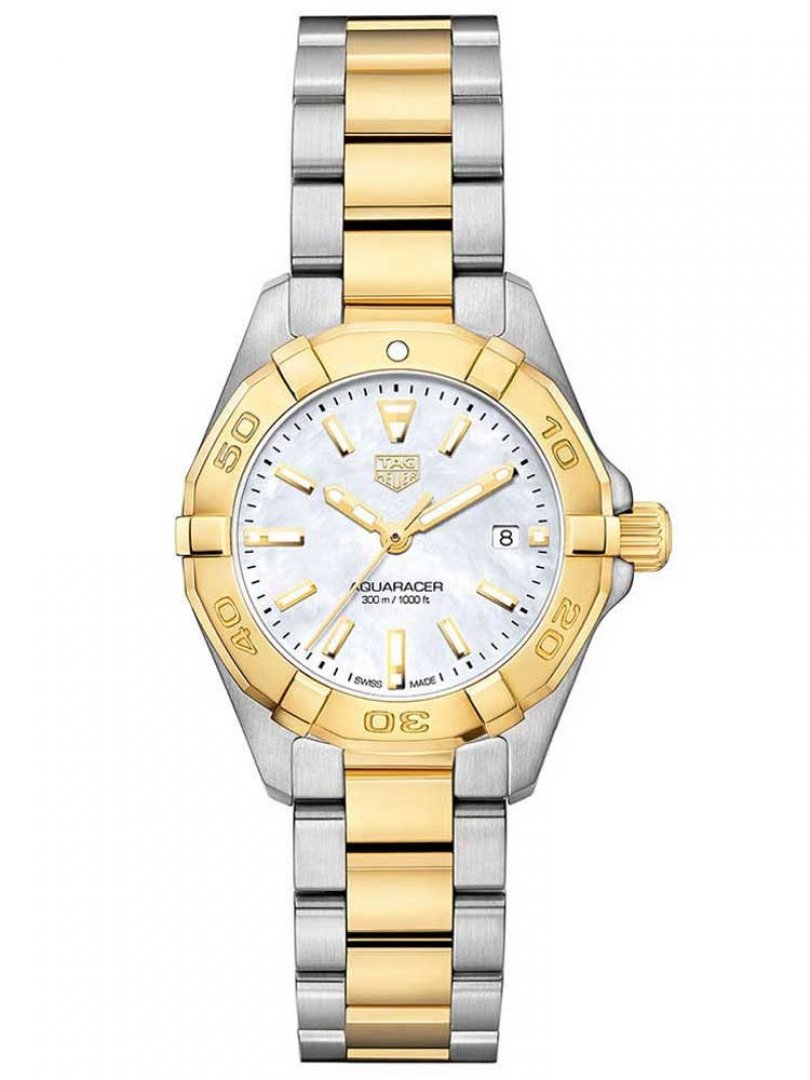 TAG Heuer Aquaracer . Die Uhr hat folgende Funktionen: Lumineszenz und Datum . Die Grundparameter der Uhr sind: ziffernblattfarbe ist perlmuttern, bewegungsart ist Quarzuhren, armbandmaterial ist Stahl und wasserabweisend ist 300 m.