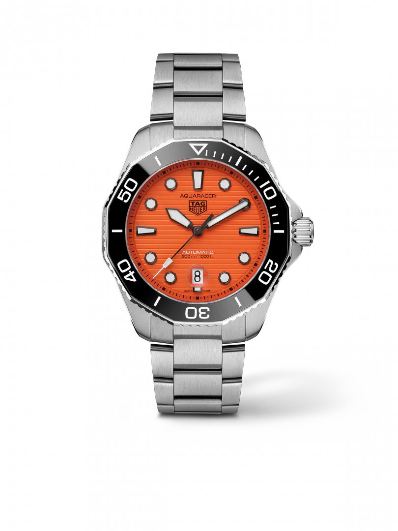 TAG Heuer Aquaracer PROFESSIONAL 300 ORANGE DIVER Automatik, Wasserdicht 300M, 43 mm. Die Uhr hat folgende Funktionen: Lumineszenz und Datum . Die Grundparameter der Uhr sind: bewegungsart ist mechanische Uhr mit automatischem Aufzug, armbandmaterial ist Stahl, wasserabweisend ist 300 m und ziffernblattfarbe ist orange.