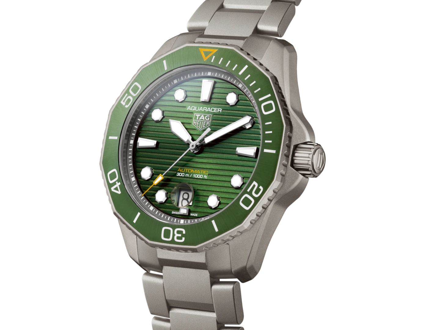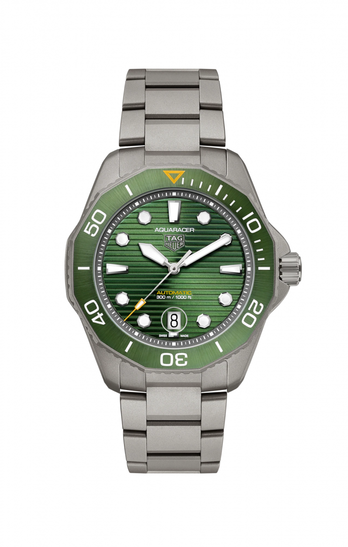 TAG Heuer Aquaracer PROFESSIONAL 300 . Die Uhr hat folgende Funktionen: Lumineszenz und Datum . Die Grundparameter der Uhr sind: bewegungsart ist mechanische Uhr mit automatischem Aufzug, wasserabweisend ist 300 m, ziffernblattfarbe ist grün und armbandmaterial ist Titan.