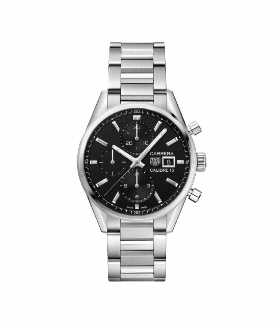 TAG Heuer Carrera . Die Uhr hat folgende Funktionen: Lumineszenz, Stoppuhr und Datum . Die Grundparameter der Uhr sind: bewegungsart ist mechanischer Chronograph mit automatischem Aufzug, armbandmaterial ist Stahl, wasserabweisend ist 100 m und ziffernblattfarbe ist schwarz.